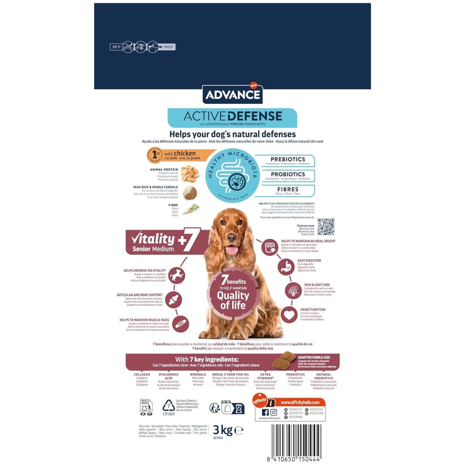 Advance Medium Senior de Pollo y Arroz, es un alimento con inmunoglobulinas y polifenoles naturales especialmente indicado para perros de raza mediana de más de 7 años que promueve un cerebro activo, un corazón sano, protección dental y unos músculos fuertes.Alimento de alta gama especialmente indicado para perros de más de 7 años de raza mediana (de 10 a 30 kg. de peso adulto) que incorpora:Condroitina y glucosamina: Su acción combinada favorece el buen mantenimiento del cartílago articular, ayudando a prevenir la aparición de problemas en las articulaciones asociados a la edad.Bajo nivel de calorías: Adaptado a la vida más sedentaria de los perros senior.Partícula mediana: Adaptada a las mandíbulas y dientes de los perros de raza mediana.Advance Medium Senior de Pollo y Arroz, es un alimento con inmunoglobulinas y polifenoles naturales especialmente indicado para perros de raza mediana de más de 7 años que promueve un cerebro activo, un corazón sano, protección dental y unos músculos fuertes.COMPOSICIONPollo (14%),harina de gluten de maíz,trigo,proteínas deshidratadas de ave,arroz (10%),harina de maíz,maíz,proteínas animales hidrolizadas,salvado de maíz,pulpa de remolacha,grasa animal,levadura,huevo deshidratado,aceite de pescado,cloruro potásico,proteínas plasmáticas,difosfato de tetrasodio,glucosamina,sulfato de condroitina y polifenoles naturales.