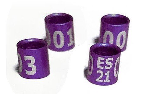 Anilla cerrada de policarbonato de gran dureza. Ligeras y muy prácticas. Especies: – Canarios: Hoso japonés, Fife nancy y Raza española.- Exóticos: Mandarines, Isabelitas del Japón, Australianos, Cantores de África, Mozambique, Cardenalito de Venezuela, Cabecita negra, Diamante de Gould, Noumeas y Gen. spinus.- Indígenas: Jilguero parva, Pardillo, Verdecillo y Lugano. Características:Borde interior con perfil cónico que evita rozaduras.Son más ligeras que las de aluminio, con un peso hasta un 50 % inferior.Menos altura que las de aluminio, lo que facilita el anillamiento.Material ultraresistente, suave e hipoalergénico.Protección ultravioleta UHV que evita la degradación o perdida de color.Gravación láser indeleble y muy visible.Color diferenciado según el año de anillamiento.Diámetro: 2,5 mm (Vea la relación entre especies y diámetro de la anilla en nuestro artículo “Las anillas de los pájaros”) Color: Morado (2021)