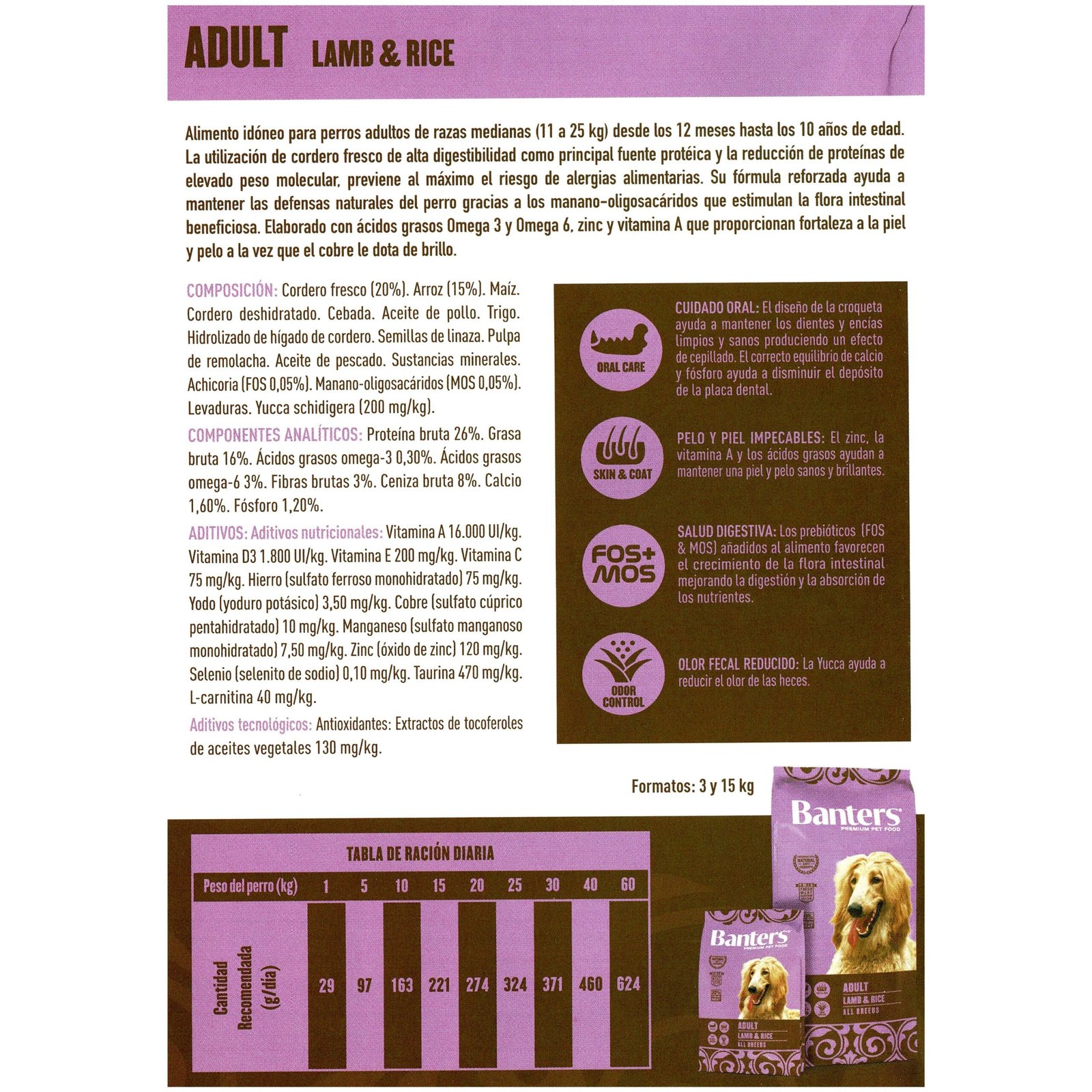 Banters Adult Lamb & RiceALIMENTO COMPLETO para PERROS ADULTOSAlimento idóneo para perros adultos de razas medianas (11 a 25 kg) desde los 12 meses hasta los 10 años de edad. La utilización de carne de cordero fresca de alta digestibilidad como principal fuente protéica y la reducción de proteínas de elevado peso molecular, previene al máximo el riesgo de alergias alimentarias. Su fórmula reforzada ayuda a mantener las defensas naturales del perro gracias a los mananooligosacáridos que estimulan la flora intestinal beneficiosa. Elaborado con ácidos grasos Omega 3 y Omega 6, zinc y vitamina A que proporcionan fortaleza a la piel y pelo a la vez que el cobre la dota de brillo.INGREDIENTES: Cordero freso (20%), Arroz (15%), Maiz, Cordero deshudratado, Cebada, Aceite de pollo, Trigo, Hidrolizado de higado de cordero, Semillas de Linaza, Pulpa de Remolacha, Aceite de pescado, Sustancias minerales, Achicoria (FOS 0.05%), Manano-oligosacaridos (MOS 0.05%), Levaduras, Yucca schidigera (200mg/kg)CONSTITUYENTES ANALITICOS: Proteína bruta 26,00 %, grasas brutos 16,00 %, acidos grasos Omega-3 0.30%, Acido grasos Omega-6 3%, Fibras brura 3%, Ceniza bruta 8%, Calcio 1.6%, Fosforo 1.20%ADITIVOS NUTRICIONALES:Vitamina A 16.000 UI/Kg. Vitamina D3 1.800 UI/Kg. Vitamina E 200 mg/Kg. Hierro (sulfato monohidratado) 75 mg/Kg. Yodo (Yoduro pota´sico) 3,5 mg/Kg. Cobre (Sulfato pentahidratado) 10 mg/Kg. Manganeso (sulfato monohidratado) 7,5 mg/Kg. Zinc (oxido) 150 mg/Kg. Selenio 0,2 mg/Kg. Taurina 470 mg/Kg. L- carnitina 40 mg/Kg.TECNOLOGICOS:Antioxidantes naturales (tocoferoles).Instrucciones de AlimentaciónAl realizar un cambio en la alimentación, se recomienda introducir gradualmente el nuevo alimento durante los 3 primeros días. Alimentar a la mascota con dos tomas diarias, según recomendación orientativa de la Tabla de Ración diaria. Su mascota puede comer más o menos dependiendo de su edad, temperamento y nivel de actividad. Disponer de agua fresca a libre disposición de la mascota. Conservar el producto en lugar fresco y seco.Tabla de Ración DiariaPesoGramosHasta 5 kg.49 – 97 g/día5 – 10 kg.97 – 163 g/día10 – 20 kg.163 – 274 g/día20 – 30 kg.274 – 371 g/día30 – 40 Kg. 371 – 460 g/día 40 – 50 Kg. 460 – 544 g/día 50 – 60 Kg. 544 – 624 g/día Beneficios- Mejora el sistema inmunitario gracias a los ácidos grasos esenciales Omega 3 y Omega 6- Favorece el tracto digestivo tras la combinación de los prebióticos: FOS y MOS- Protectores de piel y pelo gracias a la relación óptima Zinc, Cobre, Vitamina A y tocoferoles- Control del cuidado dental, Óptima relación calcio / fósforo en combinación con la fibra dietética- Carne fresca como la mejor fuente protéica que genera mayor digestibilidad y calidad del producto