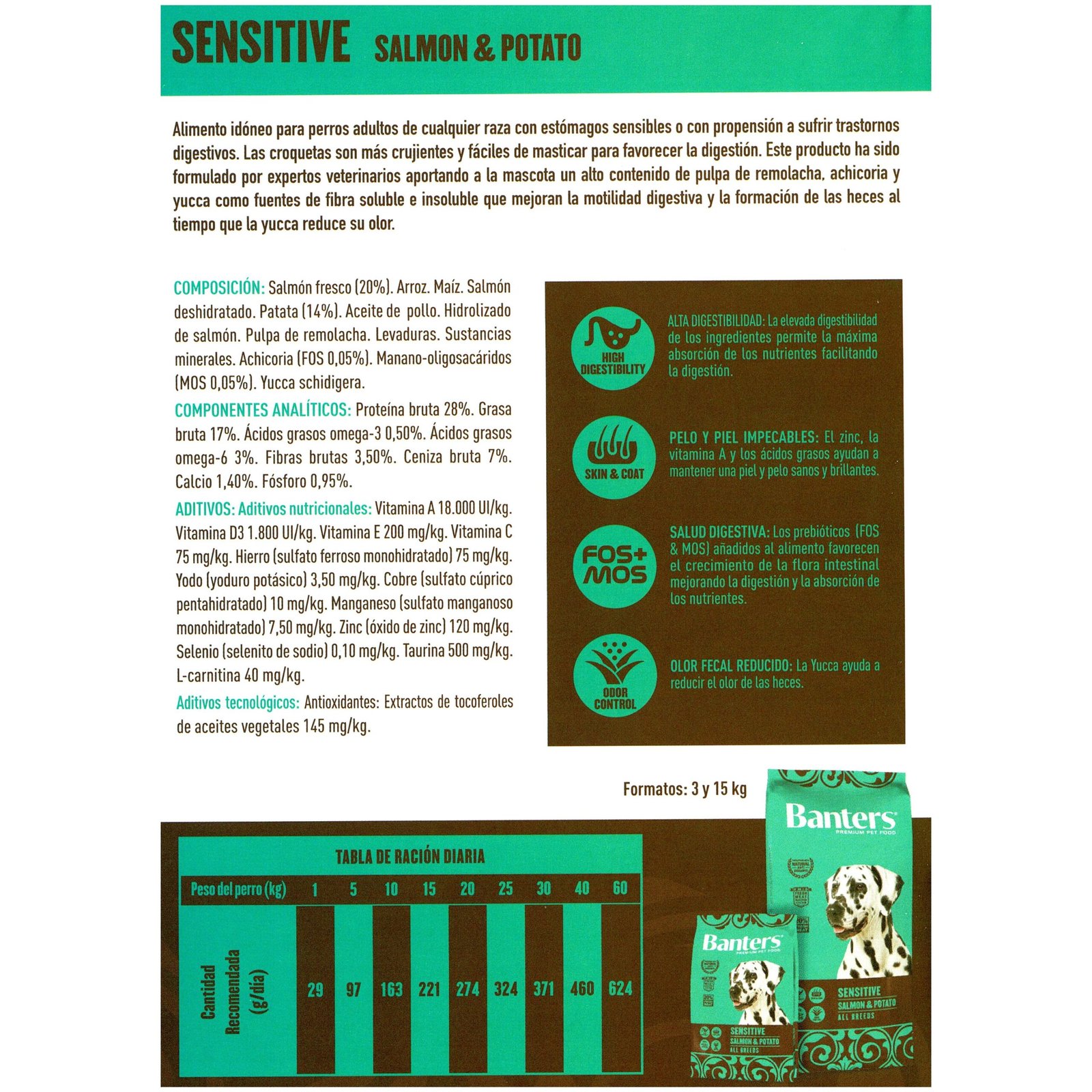 Banters Adult Sensitive es el alimento idóneo para perros adultos de cualquier raza con estómagos sensibles o con propensión a sufrir trastornos digestivos. Las croquetas son más crujientes y fáciles de masticar para favorecer la digestión. Este producto ha sido formulado por expertos veterinarios aportando a la mascota un alto contenido en arroz y avena, dos fuentes de fibra soluble e insoluble, para mejorar la motilidad digestiva y mejorar la formación de las heces.Ingredientes: Salmon Fresco (20%), Arroz, Maiz, Salmon deshidratado, Patata (14%), Aceite de pollo, Hidrolizado de salmon, Pulpa de remolacha, Levaduras, Sustancias minerales, Achicoria (FOS 0.05%), Manano-oligosacaridos (MOS 0.05%), Yucca schidigeraConstituyentes analíticos: Proteina bruta 28%, Grasa bruta 17%, Acidos grasos Omega-3 0.50%, Acidos grasos Omega-6 3%, Fibras bruta 3.50%, Ceniza bruta 7%, Calcio 1.40%, Fosforo 0.95%Aditivos: NUTRICIONALES:Vitamina A 18.000 UI/Kg. Vitamina D3 1.800 UI/Kg. Vitamina E 200 mg/Kg. Hierro (sulfato monohidratado) 75 mg/Kg. Yodo (Yoduro potásico) 3,5 mg/Kg. Cobre (Sulfato pentahidratado) 10 mg/Kg. Manganeso (sulfato monohidratado) 7,5 mg/Kg. Zinc (oxido) 150 mg/Kg. Selenio 0,2 mg/Kg. Taurina 500 mg/Kg. L- carnitina 40 mg/Kg.TECNOLÓGICOS:Antioxidantes naturales (tocoferoles).Instrucciones de AlimentaciónAl realizar un cambio en la alimentación, se recomienda introducir gradualmente el nuevo alimento durante los 3 primeros días. Alimentar a la mascota con dos tomas diarias, según recomendación orientativa de la Tabla de Ración diaria. Su mascota puede comer más o menos dependiendo de su edad, temperamento y nivel de actividad. Disponer de agua fresca a libre disposición de la mascota. Conservar el producto en lugar fresco y seco.Tabla de Ración DiariaPesoGramosHasta 5 kg.47 – 94 g/día5 – 10 kg.94 – 159 g/día10 – 20 kg.159 – 267 g/día20 – 30 kg.267 – 362 g/día30 – 40 kg. 366 – 449 g/día40 – 50 kg. 449 – 530 g/día50 – 60 kg.530 – 608 g/díaBeneficiosVisan Beneficios Banters sensitive – Mejora el sistema inmunitario gracias a los ácidos grasos esenciales Omega 3 y Omega 6- Favorece el tracto digestivo tras la combinación de los prebióticos: FOS y MOS- Protectores de piel y pelo gracias a la relación óptima Zinc, Cobre, Vitamina A y tocoferoles- Control del cuidado dental, Óptima relación calcio / fósforo en combinación con la fibra dietética- Carne fresca como la mejor fuente protéica que genera mayor digestibilidad y calidad del producto