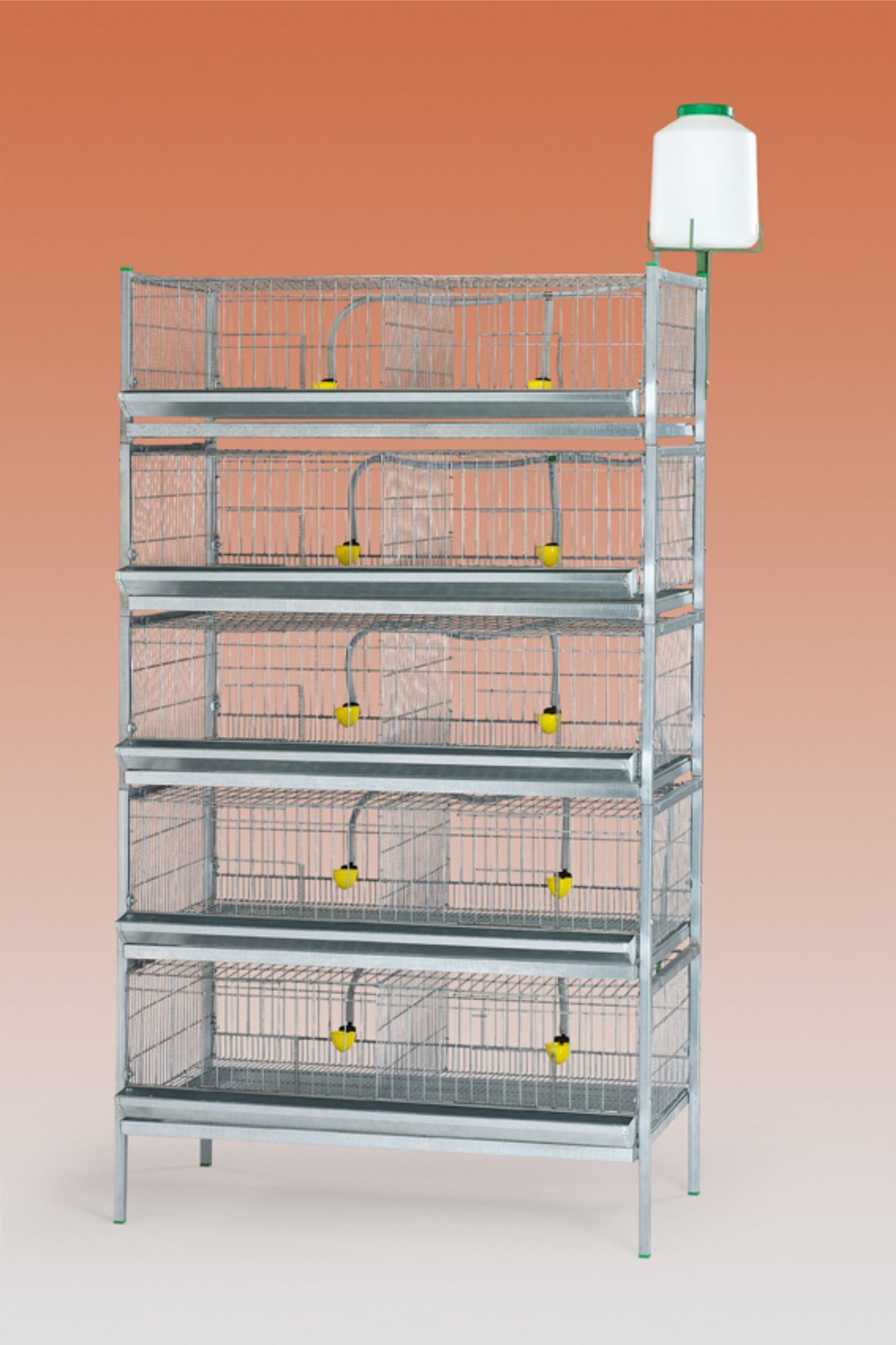 Baterías de 2 pisos y 4 compartimentos para el engorde y exposición de pollitos, codornices, palomas, etc.Especificaciones: Dimensiones comp: mm. 500 x 530 x 265 h.Dimensiones: 1050 X 620 X 835 hDispone de 2 bandejas extraibles, comedero de canal y bebederos de cazoletas con depósito de 10 L.