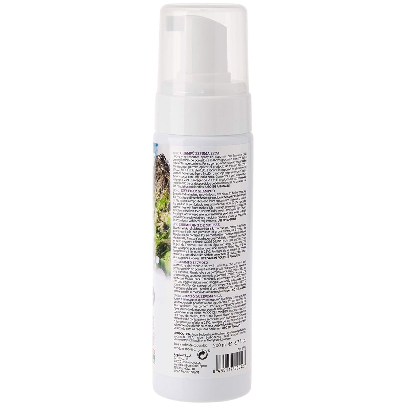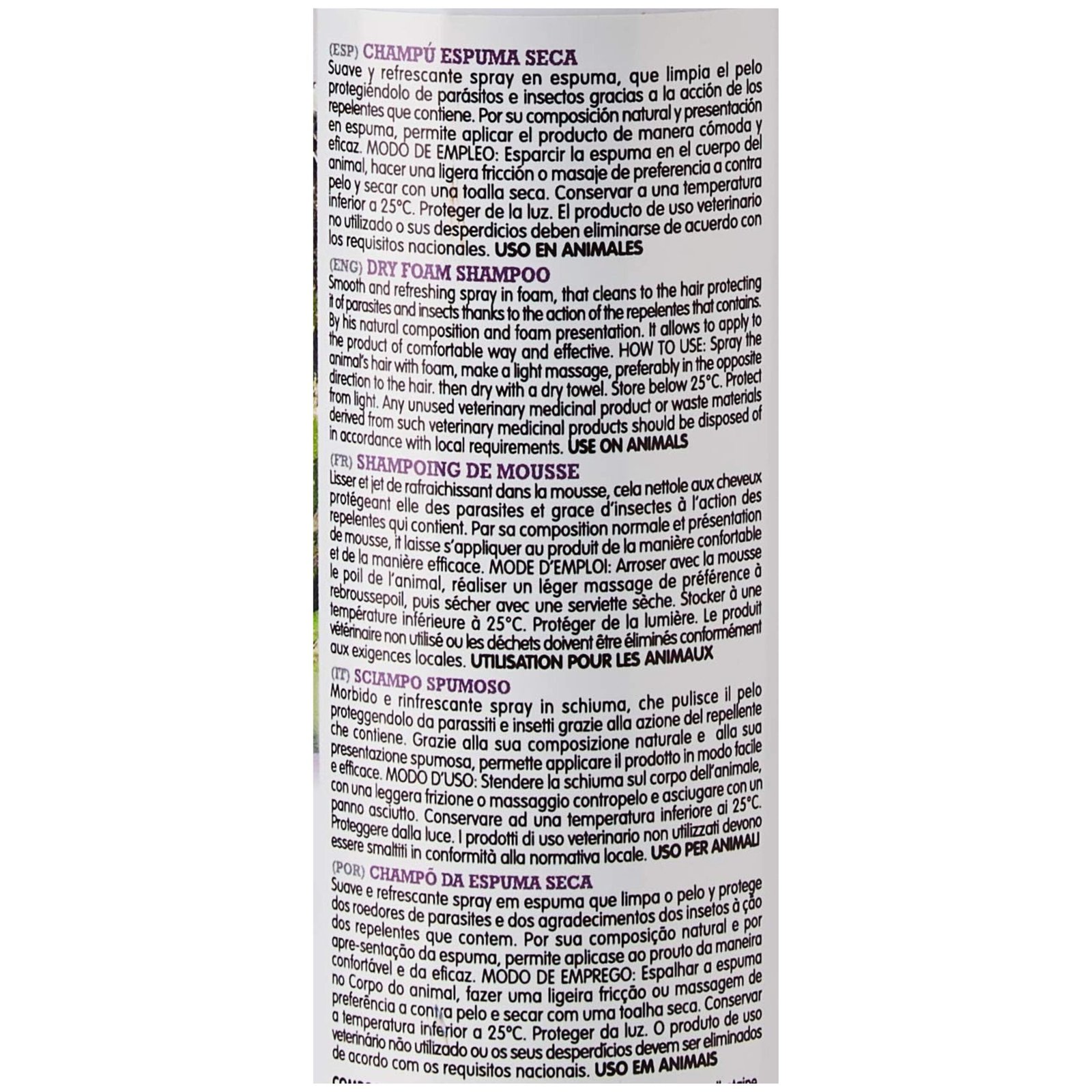 Suave y refrescante spray en espuma, que limpia el pelo protegiéndolo de parásitos e insectos gracias a la acción de los repelentes que contiene. Por su composición natural y presentación en espuma, permite aplicar el producto de manera cómoda y eficaz. Champú especialmente indicado para todo tipo de animales que por circunstancias, no es recomendable que sean mojados con agua, especialmente cachorros y hembras gestantes.MODO DE EMPLEO: Esparcir la espuma en el cuerpo del animal, hacer una ligera fricción o masaje de preferencia a contra pelo y secar con una toalla seca. Conservar a una temperatura inferior a 25ºC. Proteger de la luz. El producto de uso veterinario no utilizado o sus desperdicios deben eliminarse de acuerdo con los requisitos nacionales.USO EN ANIMALES.COMPOSICIÓN: Aqua, Sodium Laureth Sulfate, Cocamidopropylbetaine, Cocamide DEA, Aloe Barbadensis Leaf extract, Parfum, Chloromethylisothiazolinone, Methylisothiazolinone.CAPACIDAD: 200ml