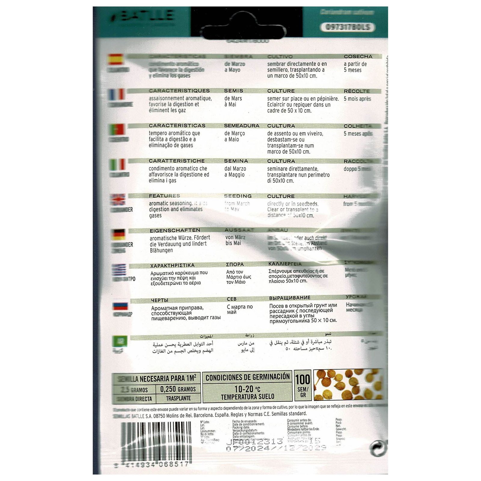 El cilantro (Coriandrum sativum) es una hierba anual de la familia de las Umbelíferas. Se aprovechan todas las partes de la planta (semillas, hojas frescas) como condimento, aromatizante o medicinal. Muy importante en la cocina India, Sudamericana y Europea. Alcanza de 40 a 70 cm de altura.CONSEJOS GENERALES PARA EL CULTIVO DEL CILANTROPrefiere los suelos de textura media y permeables. No sobrevive en terrenos encharcados.Es bastante resistente al frío aunque vegeta mejor en terrenos templados.Es de cultivo fácil y puede sembrarse en jardines o macetasLas semillas se siembran en hileras, a 30 cm. unas de otras, y a 1 cm. de profundidad.No tiene excesivos problemas fitosanitarios, aunque se puede destacar el pulgón del coriandro (Hyadaphis coriandrii) y los hongos si hay excesiva humedad.