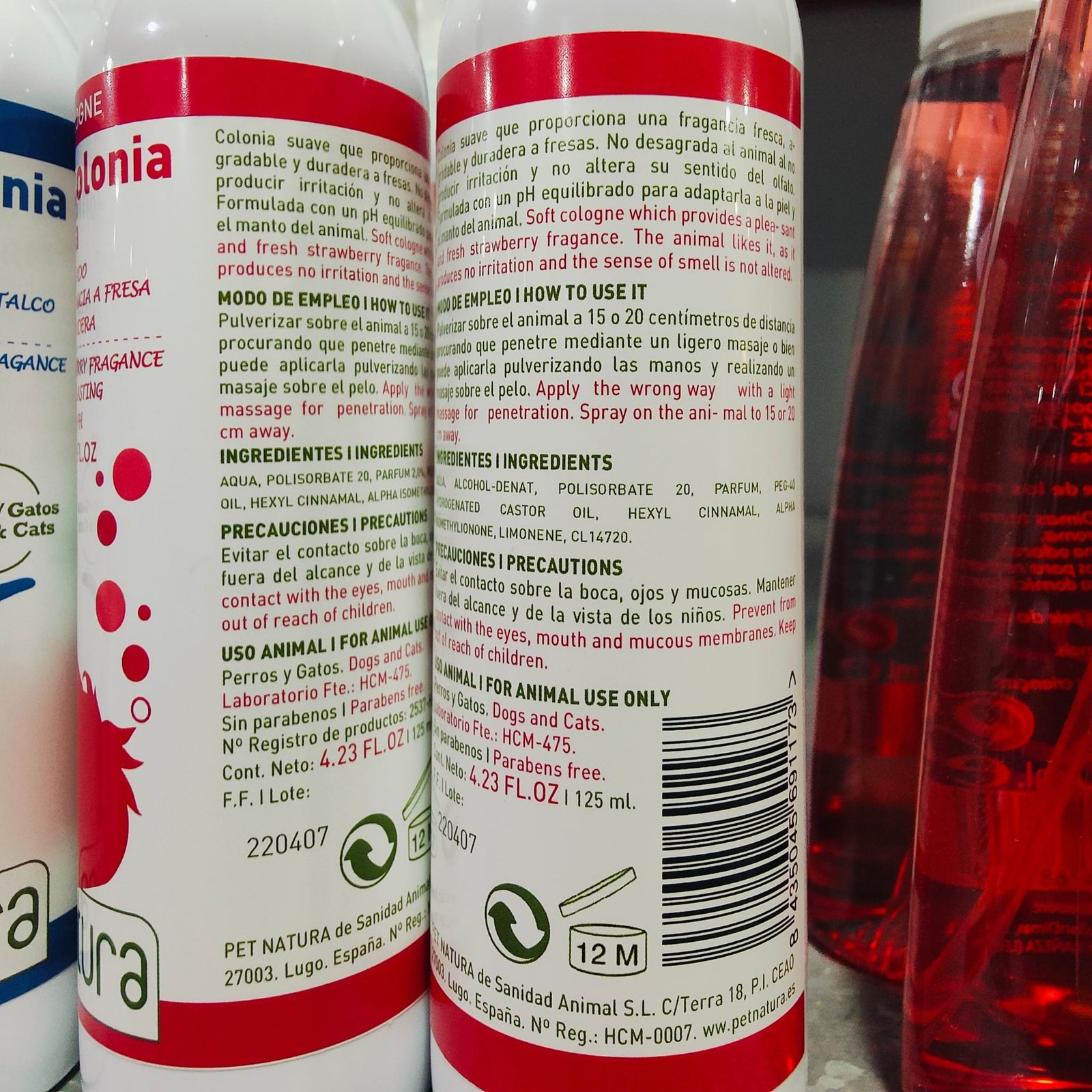 Las colonias de PetNarura, proporcionan una fragancia fresca y agradable. No desagradan al animal al no producir irritación y no alteran su sentido del olfato.Están formuladas con bajo contenido en alcohol para que no produzcan irritación y no alteran su sentido del olfato.Están formuladas con bajo contenido en alcohol para que no produzcan irritacion y con un PH equilibrado y adaptado a la piel y el manto.MODO DE EMPLEOAplicar a contrapelo procurando que penetre mediante un ligero masaje.Vaporizar sobre el animal a 15 o 20 cm. de distancia.USO ANIMALPerros y Gatos.