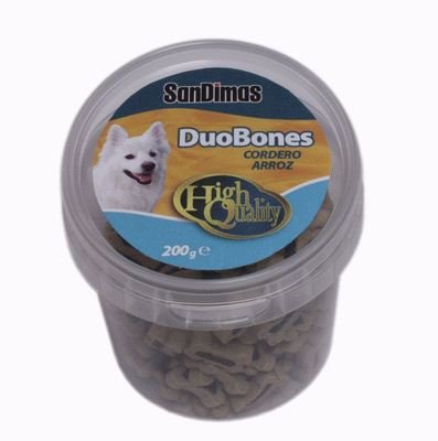 Duo Bones, alimento complementario para perros.Sabrosos snacks de cordero y arroz elaborados a partir de materias primas de primera calidad. Ideales para premiar el buen comportamiento de nuestras mascotas.COMPOSICION:Cereales (min. 4% arroz), carne y derivados de origen animal (min. 4% cordero), proteinas de extractos vegetales, derivados de origen vegetal aceites y grasas. Aditivos (CE): Conservantes y colorantes.COMPOMENTES ANALITICOS:Humedad 18%, Proteina bruta 21%, Grasas bruta 4,5%, Fibra bruta 0,5%, Ceniza bruta 5,5%.MODO DE EMPLEO:Alimentar como un premio o recompensa a cualquier hora del dia. Proporcionar siempre agua fresca a su mascota. Los perros deben ser supervisados durante su alimentacion.PRESENTACION:Botes de 200gr.Cajas de 40 sobres (60 gr. cada sobre)