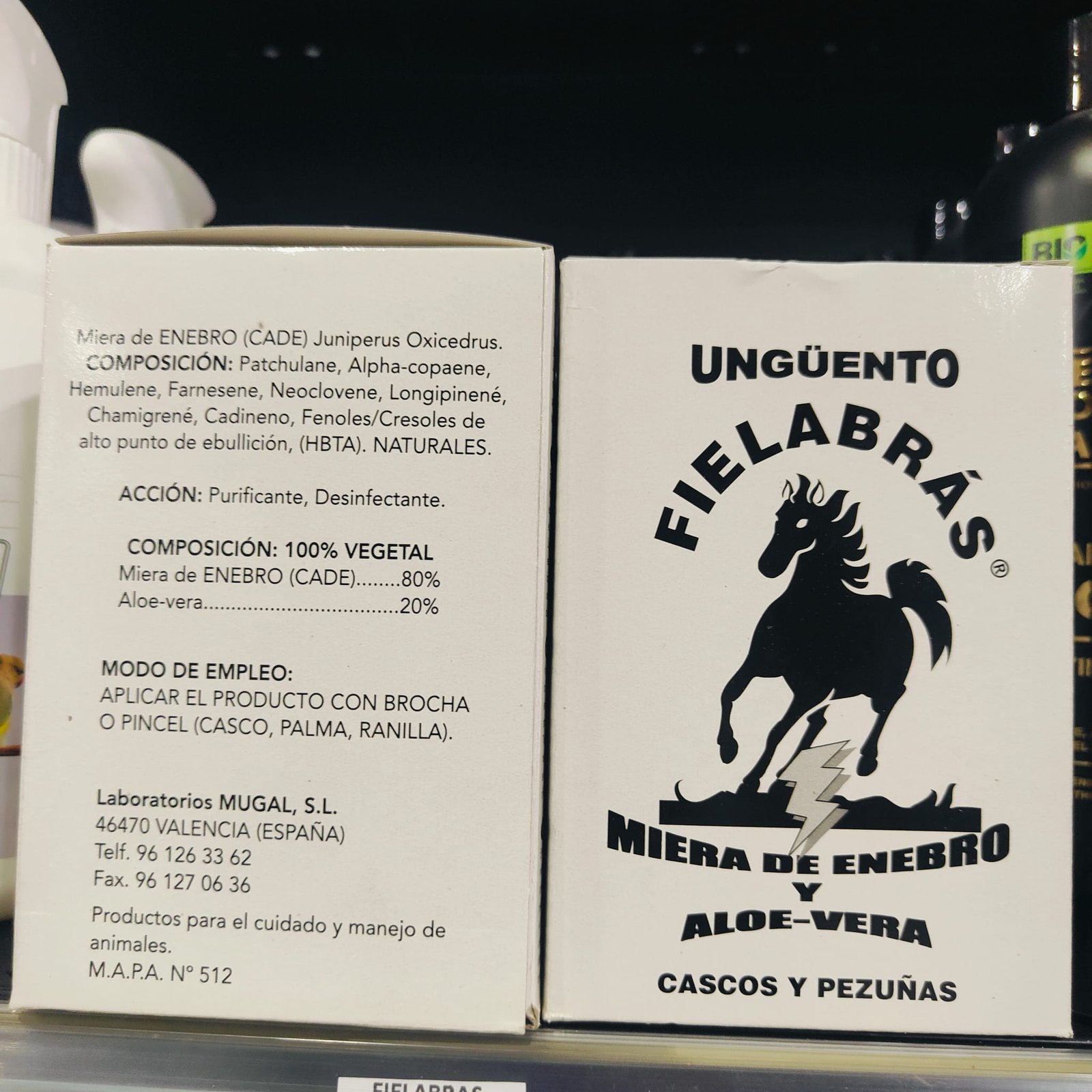 FIELABRAS CASCOS CABALLOS-MUGAL.Mugal Fielabras Cascos Caballos es un ungento de administracin tpica de gran eficacia para la proteccin y cuidados de los cascos de los caballos . Se caracteriza por fortalecer sus paredes, previene las grietas y las conserva lustrosas .Los cascos de los caballos son los que finalmente soportan todo el peso corporal del animal y su erosin es inminente debido a exposiciones a diversos suelos, arenas, estircol, caminos rocosos etc. Por ello, es fundamental fortalecer e hidratar los cascos con un maravilloso ungento como es el Mugal Fielabras, de fcil aplicacin y durabilidad.Cabe indicar que el efecto curativo en pezuas agrietadas o resecas , se suma la capacidad de ponerlos lustrosos. Perfecto para la competicin y certmenes de exposicin caballar.