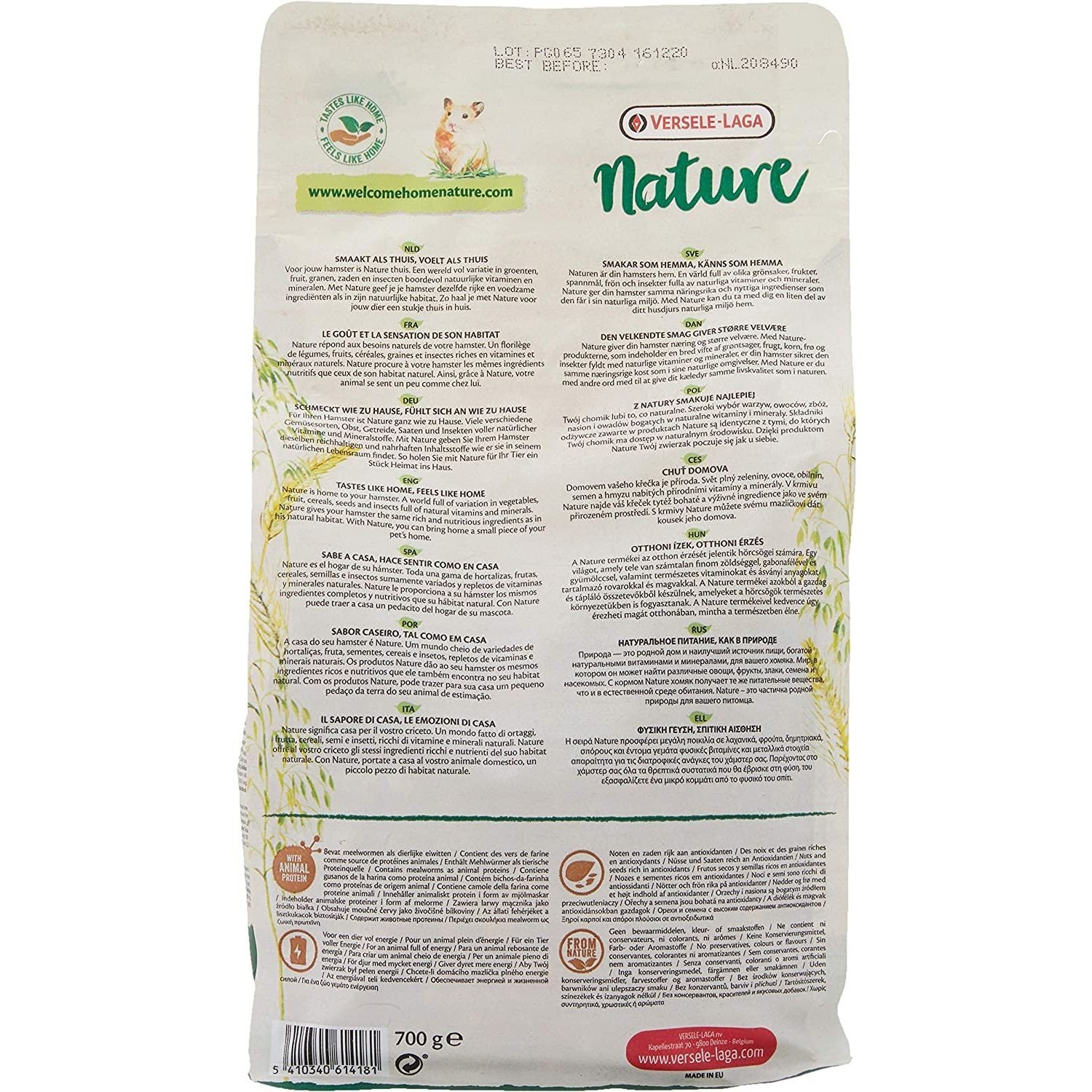 HámsterMezcla variada y rica en cereales para hámsters.- Con gusanos de la harina como proteína animal para una dieta equilibrada.- Una mezcla variada llena de nueces y semillas ricas en antioxidantes.- Composición alta en proteínas para una mascota activa llena de energía.ComposiciónCereales, derivados de origen vegetal, hortalizas (guisantes verdes 12%), semillas (girasol rayado 6%), extractos de proteínas vegetales, fruta (albaricoque 1.5%, pasas 1%), nueces, insectos (gusanos de harina 4%), minerales, Levaduras, aceites y grasas, hierbas, MOS, FOS, caléndula, semilla de uva.Constituyentes analíticosProteína 18%, contenido de grasa 9%, fibra bruta 8%, ceniza bruta 9.5%, calcio 0.7%, fósforo 0.4%Aditivos / kgAditivos nutricionalesVitamina A 11500 UI, vitamina D3 1400 UI, vitamina E 88 mg, 3b103 (hierro) 109 mg, 3b202 (yodo) 2 mg, E4 (cobre) 11 mg, 3b502 (manganeso) 85 mg, 3b603 (zinc) 80 mg, E8 (selenio) 0,23 mg, 3b815 (selenio) 0,08 mgAditivos tecnológicosAntioxidantesInstrucciones de usoRefresca comida y agua cada día. Dependiendo del tamaño y la raza, se recomienda una porción de comida diaria promedio de aproximadamente 15 g para un hámster. Combine con Nature Snacks para una variación adicional para el animal.
