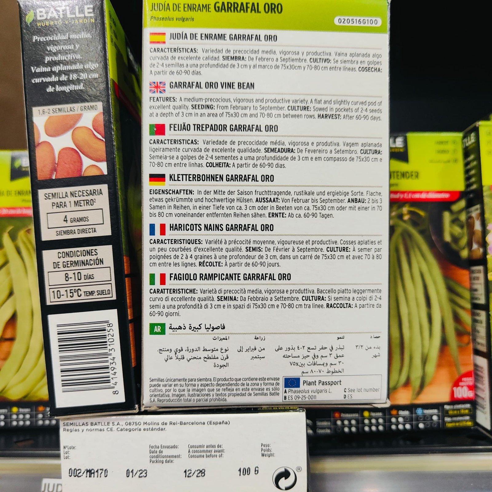 La judía de enrame para verdeo pertenece a la familia de las Leguminosas (Phaseolus vulgare). Es una planta herbácea de crecimiento anual, de crecimiento indeterminado. Se desarrolla perfectamente con tiempo templado pero con humedad. No soporta las heladas. Especie muy polimorfa en la forma de vainas (planas, redondas, cortas, largas), colores de vainas (verdes, amarillas, jaspeadas, violetas)y flores (blancas, violáceas). Las vainas no desarrollan hilos y constituyen una verdura gustosa y muy saludable.CONSEJOS GENERALES PARA EL CULTIVO DE LA JUDIABuscar parcelas bien drenadas y ligeras. Conseguir una buena aireación del suelo a base de labores antes de la siembra.Abonar con un fertilizante de fondo rico en Potasio (1-1-3). Si se incorpora estiércol deberá hacerse con 6 meses de antelación para evitar problemas fitosanitarios en cuello y raíz.Añadir un insecticida efectivo para combatir plagas del suelo (gusanos del alambre, gusanos grises, mosca de la judía, etc.)Sembrar en la época adecuada para cada zona, según la variedad y el momento de recolección que se desee. El suelo debe estar en tempero para conseguir una buena emergencia y evitar todo lo posible, problemas de nascencia derivados de la formación de costra.La dosis de siembra para variedades de enrame es de 2-4 semillas por golpe a un marco de 1mx0.3-0.5 m. gastándose de 60 a 100 Kg según pmg.Siempre se debe mantener el campo libre de malas hierbas a base de herbicidas o escardas manuales.Se deben colocar tutores (mallas, cañas…).Evitar los riegos excesivos que provoquen encharcamientos y la falta de agua sobre todo en la floración. El riego por goteo y aspersión es muy adecuado para este cultivo. El suministro correcto de agua evita muchos problemas de raíz (Fusarium, Pytium, RhizoctoniaCuidar con esmero la sanidad del cultivo y mantener limpios los márgenes de las parcelas. Los tratamientos deberán ser periódicos y preventivos.En Primavera y con humedad, tratar contra Antracnosis, Botritis y algún ataque esporádico de pulgón.En Verano el problema más importante es el de la araña amarilla cuya falta de control puede destruir todo el cultivo. También puede haber trips que producen deformaciones en las vainas.En Otoño tratar contra Roya, Sclerotinia y pulgón principalmente.Realizar los tratamientos fitosanitarios a primera hora de la mañana.Los aporte nitrogenados en cobertera deben ser de menos de 50 UF. N. y fraccionados, ya que podría producir un excesivo desarrollo vegetativo y un desequilibrio fisiológico que produciría falta de cuajado de vainas.Recolectar a menudo (1-3 días según variedades) para evitar el endurecimiento de las vainas.JUDIA ENRAME GARRAFAL OROVariedad de precocidad media, vigorosa y productiva. Vaina aplanada algo curvada de excelente calidad, de 18-20 cm de longitud 1,5-1,8 cm de anchura. No forma hilo ni marca el grano. La semilla es grande de color crema rosado. Muy adecuada para verdeo.