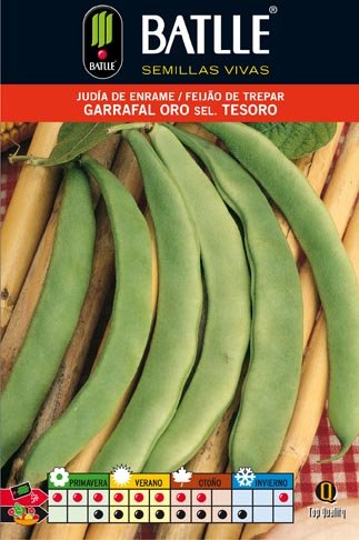 La judía de enrame para verdeo pertenece a la familia de las Leguminosas (Phaseolus vulgare). Es una planta herbácea de crecimiento anual, de crecimiento indeterminado. Se desarrolla perfectamente con tiempo templado pero con humedad. No soporta las heladas. Especie muy polimorfa en la forma de vainas (planas, redondas, cortas, largas), colores de vainas (verdes, amarillas, jaspeadas, violetas)y flores (blancas, violáceas). Las vainas no desarrollan hilos y constituyen una verdura gustosa y muy saludable.CONSEJOS GENERALES PARA EL CULTIVO DE LA JUDIABuscar parcelas bien drenadas y ligeras. Conseguir una buena aireación del suelo a base de labores antes de la siembra.Abonar con un fertilizante de fondo rico en Potasio (1-1-3). Si se incorpora estiércol deberá hacerse con 6 meses de antelación para evitar problemas fitosanitarios en cuello y raíz.Añadir un insecticida efectivo para combatir plagas del suelo (gusanos del alambre, gusanos grises, mosca de la judía, etc.)Sembrar en la época adecuada para cada zona, según la variedad y el momento de recolección que se desee. El suelo debe estar en tempero para conseguir una buena emergencia y evitar todo lo posible, problemas de nascencia derivados de la formación de costra.La dosis de siembra para variedades de enrame es de 2-4 semillas por golpe a un marco de 1mx0.3-0.5 m. gastándose de 60 a 100 Kg según pmg.Siempre se debe mantener el campo libre de malas hierbas a base de herbicidas o escardas manuales.Se deben colocar tutores (mallas, cañas…).Evitar los riegos excesivos que provoquen encharcamientos y la falta de agua sobre todo en la floración. El riego por goteo y aspersión es muy adecuado para este cultivo. El suministro correcto de agua evita muchos problemas de raíz (Fusarium, Pytium, RhizoctoniaCuidar con esmero la sanidad del cultivo y mantener limpios los márgenes de las parcelas. Los tratamientos deberán ser periódicos y preventivos.En Primavera y con humedad, tratar contra Antracnosis, Botritis y algún ataque esporádico de pulgón.En Verano el problema más importante es el de la araña amarilla cuya falta de control puede destruir todo el cultivo. También puede haber trips que producen deformaciones en las vainas.En Otoño tratar contra Roya, Sclerotinia y pulgón principalmente.Realizar los tratamientos fitosanitarios a primera hora de la mañana.Los aporte nitrogenados en cobertera deben ser de menos de 50 UF. N. y fraccionados, ya que podría producir un excesivo desarrollo vegetativo y un desequilibrio fisiológico que produciría falta de cuajado de vainas.Recolectar a menudo (1-3 días según variedades) para evitar el endurecimiento de las vainas.JUDIA ENRAME GARRAFAL OROVariedad de precocidad media, vigorosa y productiva. Vaina aplanada algo curvada de excelente calidad, de 18-20 cm de longitud 1,5-1,8 cm de anchura. No forma hilo ni marca el grano. La semilla es grande de color crema rosado. Muy adecuada para verdeo.