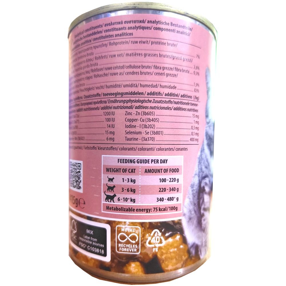 Alimento equilibrado que cubre las necesidades normales de los gatos proporcionandoles proteinas de buena calidad y grasa rica en acidos grasos insaturados.Ingredientes: carne, suproductos pescado, cereales, extractos de proteinas,minerales. analisis: humedad 81 %, proteina 8 % , grasa 5,5 %, celulosa 0,7 %, ceniza 2,3 %