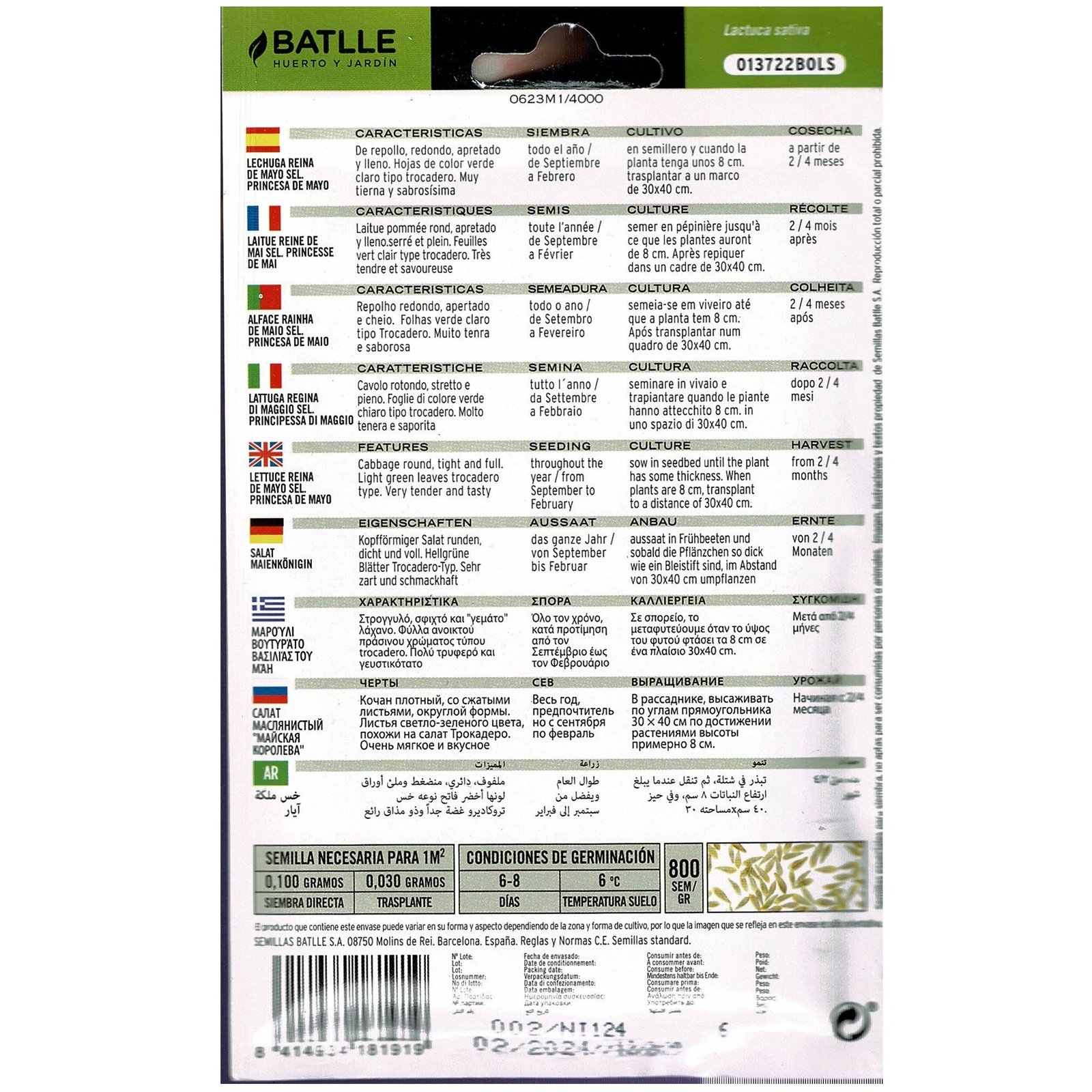 La lechuga pertenece a la familia de las Compuestas (Lactuca sativa L.) es una planta anual, propia de las regiones semi-templadas, que se cultiva con fines alimentarios y se aprovechan las hojas. Es una especie extraordinariamente polimorfa en colores (verdes, amarillentas, moradas), texturas (crujientes, mantecosas, batavias) y diferentes formas de hojas. Las hojas son de sabor dulce y son consumidas crudas. Se pueden cultivar y consumir durante todo el año.La lechuga Mantecosa es de textura suave, que forma cogollos compactos de forma redondeada, con hojas de borde casi lisos.CONSEJOS GENERALES PARA EL CULTIVOPrefiere los climas templados y húmedos. Hay variedades de lechuga aptas para cultivar en diversas condiciones de clima, zona y época durante el año. Para obtener una adecuada producción en cantidad y calidad se deberán elegir las que se adapten mejor. Si no seguimos estas premisas puede dar lugar a la aparición de fisiopatías, falta de desarrollo o una rápida subida a flor.Para conseguir buenas piezas en tamaño y calidad se deben cuidar adecuadamente.En el semillero:Utilizar un sustrato adecuado para el desarrollo de la lechuga hasta el momento del trasplante (5-7 hojas). Es recomendable usar bandejas para hacer plantas con cepellón, las cuales tendrán un menor número de fallos tras el trasplante.Escoger la variedad adecuada para el tipo de cultivo, época de siembra y exigencias del mercado .Después de la siembra es aconsejable mantener la temperatura cercana a 5ºC durante 48 horas para evitar la dormancia.Más tarde la temperatura se mantendrá entre 20 y 25ºC y con humedad constante elevada. Tratar con fungicidas e insecticidas si fuera necesario. Con estas condiciones a los 25-30 días se obtendrán plantas listas para trasplantar.En el terreno definitivo:Buscar parcelas bien drenadas y preparar el suelo de formas que quede perfectamente mullido.Abonar con un fertilizante de fondo equilibrado (2-1-3).Añadir un insecticida efectivo para combatir las posibles plagas de suelo.Mantener el campo libre de malas hierbas.Es recomendable la plantación en pequeños caballones para evitar problemas de pudrición tanto en cuello como en raiz.El marco de plantación puede oscilar entre 20-40 entre plantas y 30-60 entre líneas.Aportar el agua de riego controlada para que haya una humedad lo más constante posible en el suelo. Su falta provocará la subida a flor prematura y poca pudrición y el exceso asfixia, pudriciones y carencias.Cuidar con esmero la sanidad del cultivo evitando los ataques de pulgones y trips con productos preventivos autorizados ya que son los tramisores de diferentes virosis y controlar con fungicidas el Mildiu , Botritys y Sclerotinia.Los aportes nitrogenados en cobertera son aconsejables y se deben fraccionar en 2-3 veces llegando a 100 U.N./Ha, siempre antes del inicio del acogollado.LECHUGA REINA DE MAYO SEL. PRINCESADe repollo, redondo, apretado y lleno. Hojas de color verde claro tipo trocadero. Muy tierna y sabrosísima. Apropiado para primavera y principios de verano. Forma de cultivo: Se siembra de septiembre a febrero en semillero, trasplantando al marco de 30×40 cms. cuando las plantitas tienen de 3 a 4 hojas. Prefiere terrenos expuestos al sol, fértiles y ligeros. Las siembras de invierno en climas fríos deben efectuarse en semillero bien abrigado. Recolección: A los 3 ó 4 meses de su siembra.