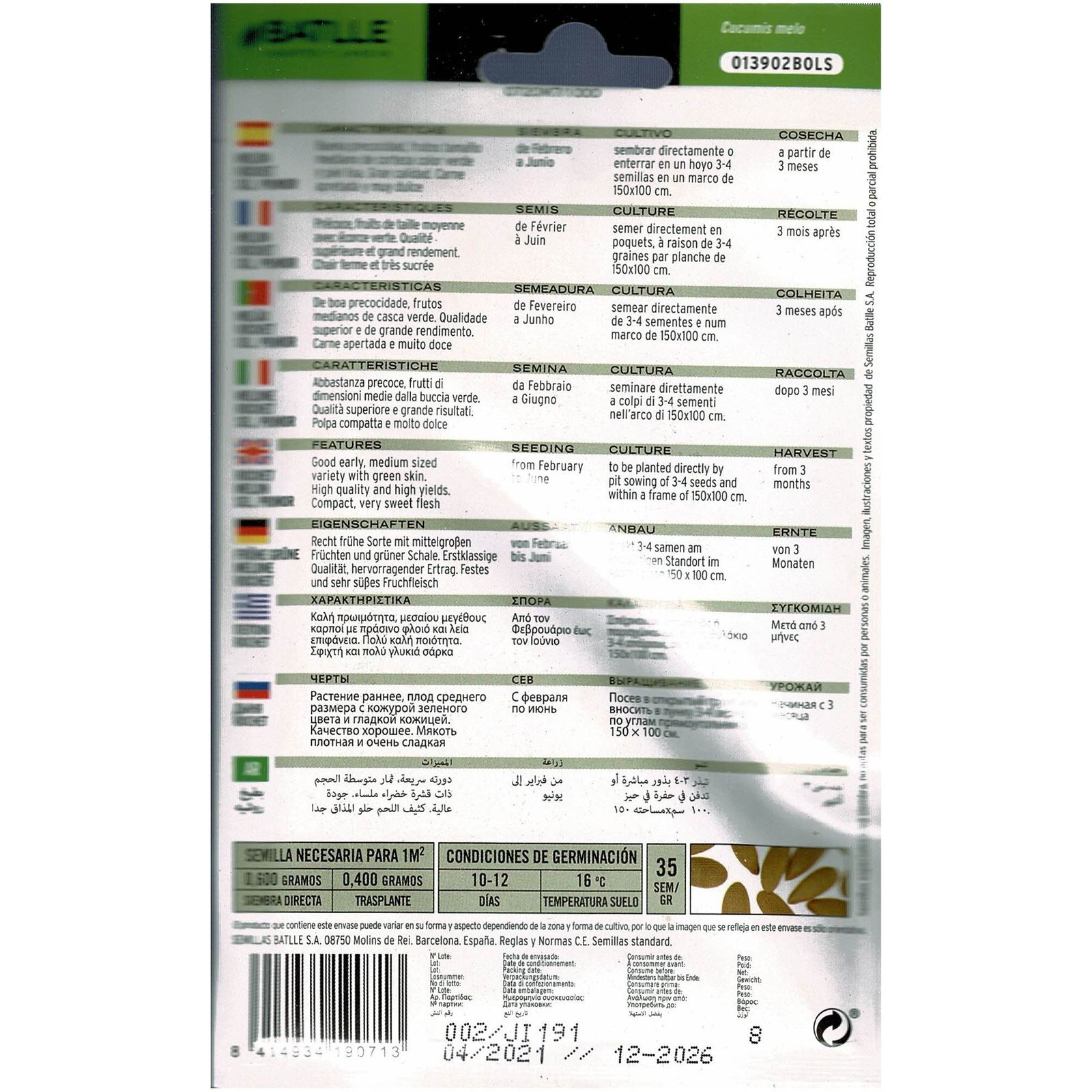 El melón (Cucumis melo) es una planta herbácea de tallos rastreros. Se cultiva por su fruto, una baya grande muy apetecible en verano por su gran contenido de agua y de sabor dulce.La planta posee tallos blandos y pilosos que crecen a ras de suelo. Las flores son amarillas y las hay masculinas, femeninas y hermafroditas. Es una especie extraordinariamente polimorfa tanto en el tipo de fruto como en la pulpa. El color del fruto va de blanco a verde muy oscuro pasando por amarillo, escriturado, manchado (El Piel de Sapo español).La forma del fruto va desde esférica hasta elipsoidal. Su tamaño es dependiente de la variedad y de las condiciones de cultivo. De este modo, hay melones pequeños que pesan alrededor de 400 g y otros muy grandes que pueden pesar hasta 10 Kg, La pulpa es aromática, con textura suave y diferentes colores: amarillo, verde, rosado y tonos intermedios.CONSEJOS GENERALES PARA EL CULTIVO DEL MELONSe siembra de Enero a Mayo según el ciclo deseado y la zona de cultivo.Puede hacerse directamente en el suelo y después aclarar o en bandejas para su posterior trasplante cuando tengan 2-3 hojas.Elegir parcelas bien drenadas y sanas.No repetir el cultivo de melón en la misma parcela hasta pasados 3 años.Se recomienda el riego por goteo.Se gana precocidad y producción con acolchado plástico o tunelillos.Estar atentos a los problemas fitosanitarios, principalmente oidio, araña y fusarium.Recolección a partir de Junio en las zonas más precoces.Conseguiremos más dulzura en los frutos escogiendo suelos profundos que no haya que regar mucho.No tiene excesiva conservación, pero hay tipos como el Tendral que pueden conservarse.MELON ROCHET SEL. PRIMORVariedad de buena precocidad, frutos tamaño mediano de corteza color verde y piel lisa. Calidad superior y de gran rendimiento. Carne apretada y muy dulce.Forma de cultivo: Se siembra de Febrero a Mayo de asiento, a golpes y marco de 150 x 100 cms. Los hoyos se rellenan con mantillo con una ligera capa de tierra encima depositando en ella 5 a 6 semillas. Cuando las plantitas alcanzan unos 10 cms. de altura aclarar, dejando solamente en cada golpe las 2 más desarrolladas.Recolección: Julio, Agosto y Septiembre.