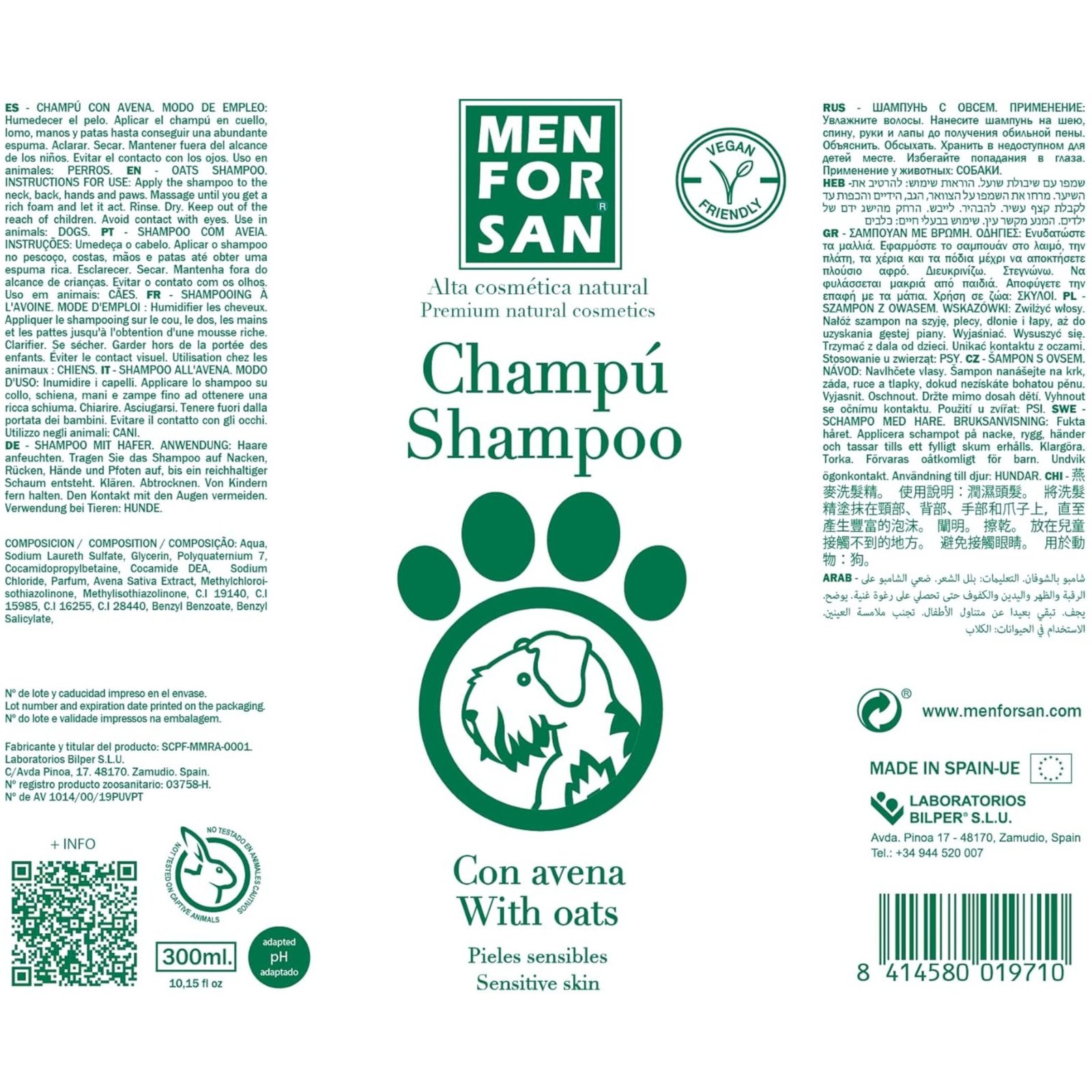 CHAMPÚ NATURAL CON AVENAChampú natural de máxima calidad con avena para perros con pieles delicadas, demasiado secas, muy sensibles o irritadas. También está indicado para razas con pelajes frágiles, finos y pieles normales. La suavidad de la formula y las propiedades cosméticas de la avena protegen la piel y el pelaje mejorando y manteniendo la hidratación natural y permitiendo un uso frecuente sin alterar las propiedades protectoras de la piel.