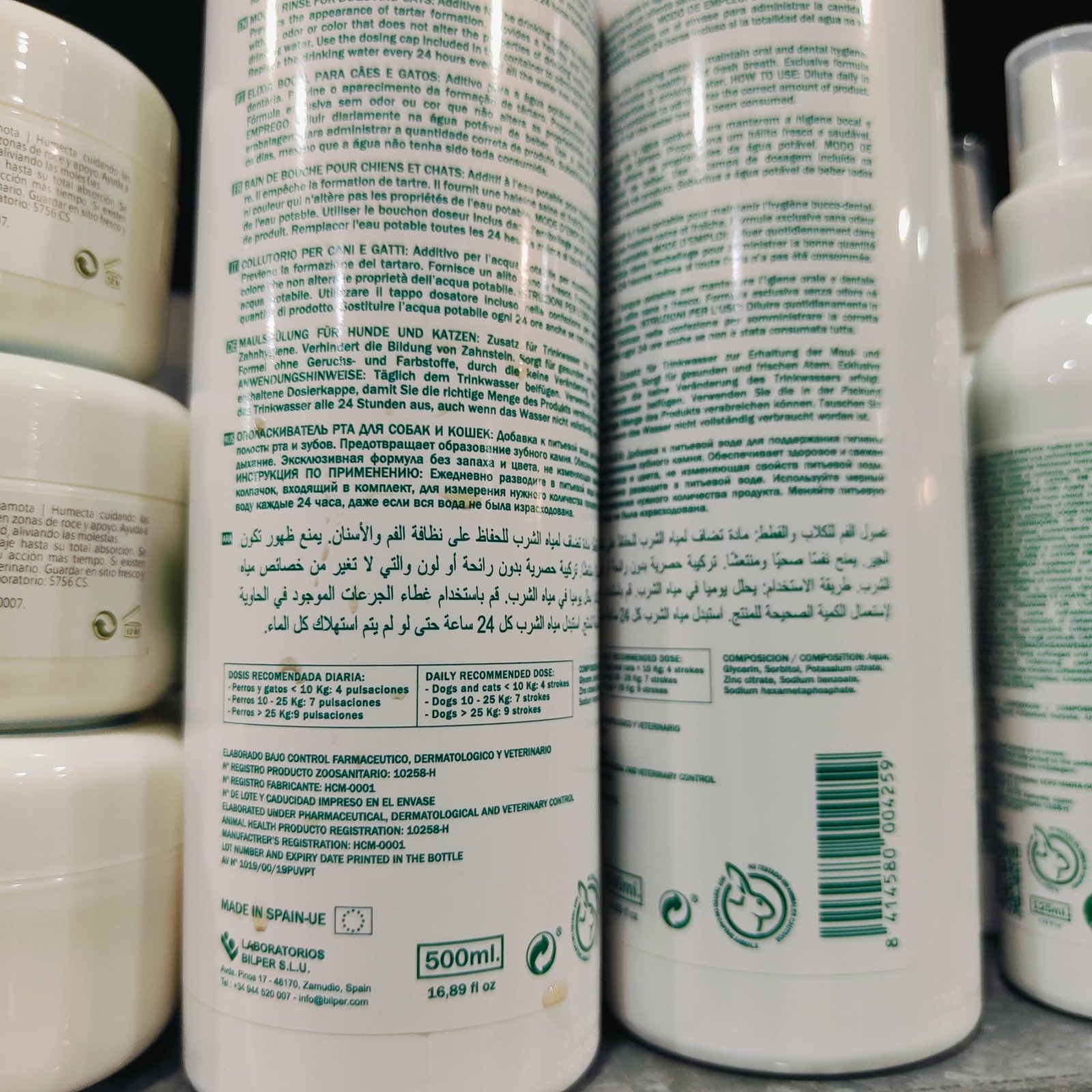 Es un innovador producto anti sarro que se usa diluido en el agua de tu mascota. Ayuda a mantener la higiene oral y dental.Este producto es muy efectivo si se usa de forma diaria y previene la aparición de placa dental y la formación de sarro previniendo las enfermedades periodontales.Así mismo, combate la halitosis y proporciona un aliento sano y fresco. Exclusiva fórmula sin olor ni color que no altera las propiedades del agua de bebida.Los dientes de tu mejor amigo se verán más blancos y el aliento será más fresco, incluso en los casos de animales propensos a la creación de sarro.PREVIENE LA APARICIÓN DE PLACA DENTAL Y SARRO PARA EVITAR ENFERMEDADES PERIODONTALESVENTAJASPresenta componentes naturales que combaten el mal aliento.Eficaz contra la acumulación de sarroPreviene las enfermedades periodontalesDientes más blancosSin olorSin colorantes.No altera las propiedades de agua de bebida.Previene la aparición de la placa dentalProducto registrado en Portugal, nº registro 1019/00/19PUVPTMODO DE EMPLEOUtilizar en animales que ya tienen una dentición adulta. Diluir diariamente en el agua de bebida. Utilizar el tapón incluido en el envase para administrar la cantidad correcta de producto. Reemplazar el agua de bebida cada 24 horas incluso si la totalidad del agua no se ha consumido.DOSIS RECOMENDADA DIARIA:Perros < 10 Kg: 10ml (1/2 tapón)Perros 10-25 Kg: 15ml (2/3 tapón)Perros < 25 Kg: 15ml (1 tapón).
