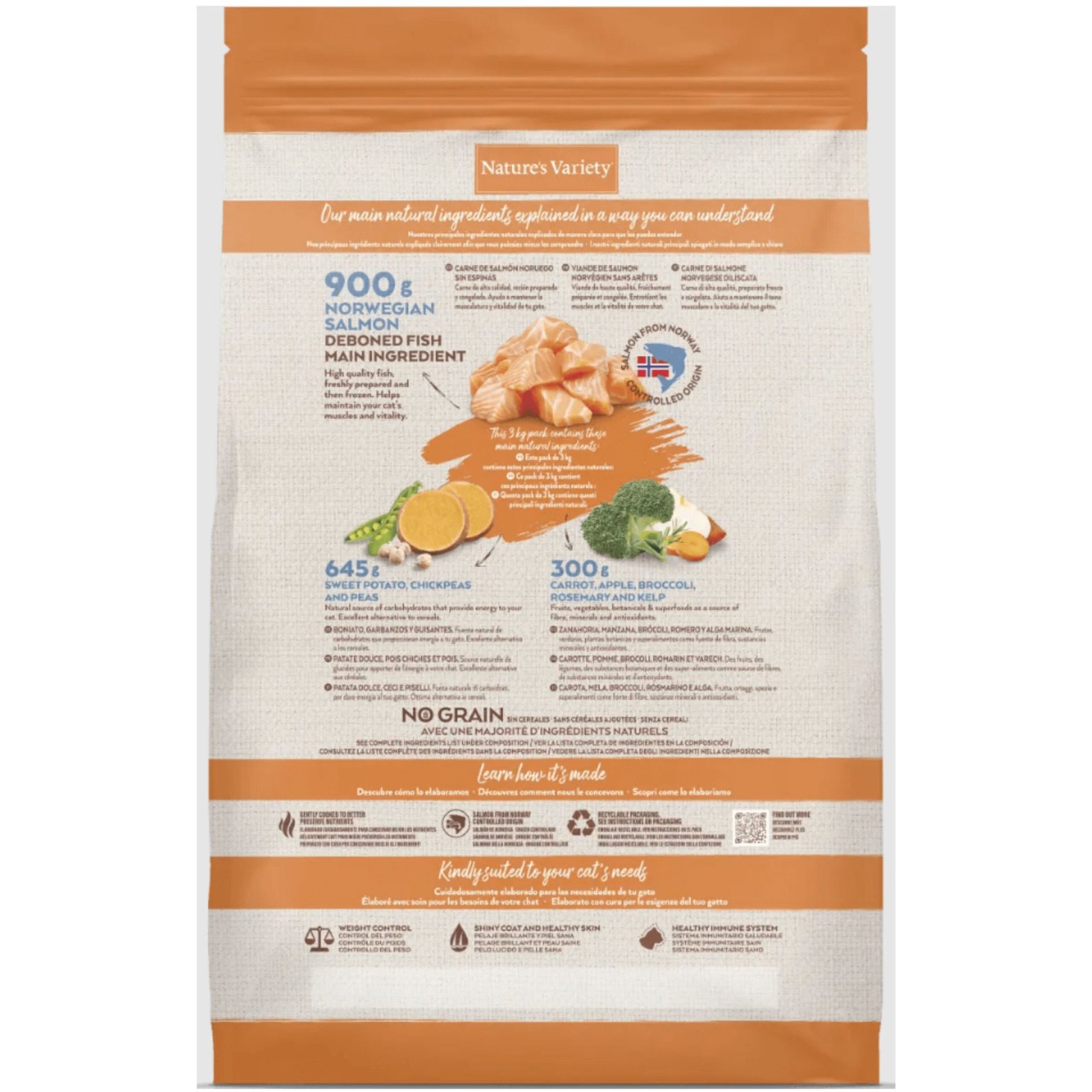 Comida para gatos esterilizados Nature’s Variety Selected No Grain SterilizedTu True Instinct de siempre es ahora Nature’s Variety, con las mismas características nutricionales y sabor, pero con una nueva fórmula mejorada.El pienso para gatos Nature’s Variety Selected Sterilized Salmón ofrece a tu felino una alimentación completa y equilibrada que cuida su salud a la vez que le ayuda a mantenerse en su peso ideal. Se trata de una receta especialmente recomendada para los gatos adultos esterilizados, con un contenido adaptado de grasas para evitar el aumento de peso.Esta comida para gatos está hecha con salmón noruego sin espinas como ingrediente principal. Por otro lado, utiliza carbohidratos alternativos como los guisantes, las patatas y los garbanzos en lugar de los cereales. Así, mejora las digestiones y previene de intolerancias alimentarias. Una opción ideal para aquellos gatos que tienen el estómago sensible o alergia al grano. Junto al pescado, incorpora frutas, verduras y superalimentos como la manzana, el brócoli, la zanahoria, el alga marina y el romero. De esta forma, está repleto de proteínas, vitaminas, minerales y antioxidantes. Además, no contiene ningún aditivo artificial, como conservantes, colorantes o saborizantes.VENTAJAS DEL PIENSO NATURE’S VARIETY SELECTED STERILIZED SALMÓN:Pienso completo para gatos esterilizados.Elaborado con ingredientes naturales.Con salmón noruego como ingrediente principal.Rico en frutas y verduras.Rico en ácidos grasos omega 3 y omega 6.Sin cereales.Sin conservantes, colorantes ni sabores artificiales.Ayuda al control de peso.Favorece una buena digestión.USO Y ESPECIFICACIONES:Alimento seco completo y equilibrado para gatos adultos esterilizados.Descripción nutricional:Ingredientes: Carne de salmón noruego sin espinas* (30%), guisantes deshidratados* (13%), proteína de patata, proteína deshidratada de atún (8%), proteína deshidratada de salmón (7%), almidón de guisante*, garbanzos deshidratados* (4,5%), boniato deshidratado* (4%), grasa avícola* (3%), hidrolizado de proteína (3%), fibra de guisante*, raíz de achicoria deshidratada*, sustancias minerales, zanahoria deshidratada* (0,5%, equivalente a un 4% de zanahoria fresca), brócoli deshidratado* (0,5%, equivalente a un 4% de brócoli fresco), manzana deshidratada* (0,3%, equivalente a un 2% de manzana fresca), alga marina deshidratada* (0,01%), romero deshidratado* (0,01%). *Ingredientes naturales.Constituyentes analíticos: Proteína bruta 37%, grasa bruta 15%, fibra bruta 4%, ceniza bruta 8,5%, O3 1,1%, O6 2,1%.Aditivos nutricionales: Vitamina A 27000 UI, vitamina E 410 mg, vitamina C 350 mg, taurina 1000 mg, sulfato de hierro(II) monohidratado 260 mg (Fe: 86 mg) yoduro de potasio 1,9 mg (I: 1,4 mg), sulfato de cobre(II) pentahidratado 33 mg (Cu: 8,8 mg), sulfato de manganeso monohidratado 123 mg (Mn: 40 mg), sulfato de zinc monohidratado 352 mg (Zn: 128 mg), selenito de sodio 0,24 mg (Se: 0,11 mg). Aditivos zootécnicos: Cloruro de amonio 5 g.
