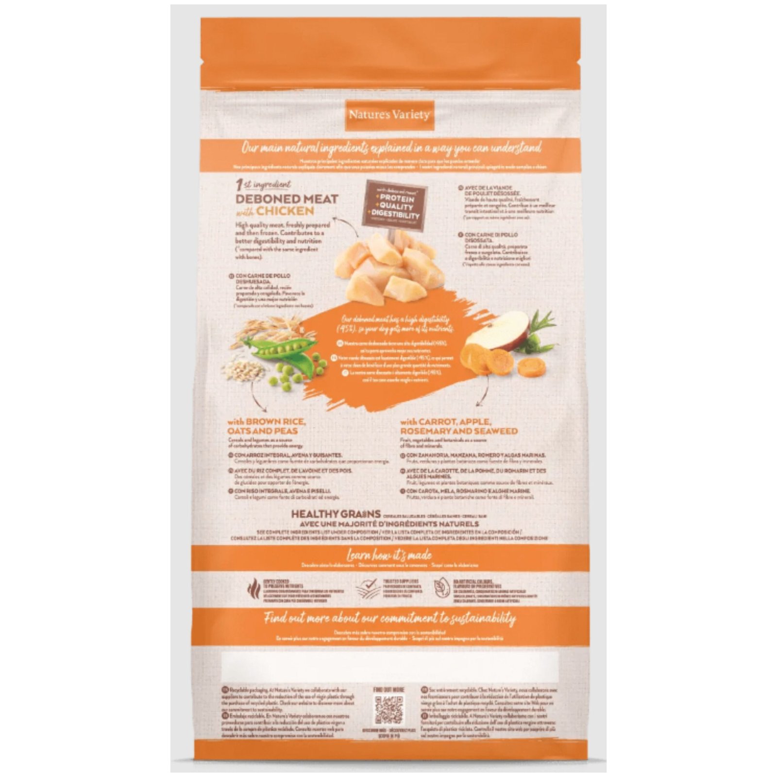 NATURES VARIETY HEALTHY GRAIN MINI ADULT POLLO 1,5 Kg.Alimento completo y equilibrado para perros adultos de pequeño tamaño.Elaborado con carne de pollo campero deshuesada como principal ingrediente. Complementado con frutas y verduras cuidadosamente seleccionadas y cereales saludables.ComposicionCarne de pollo deshuesada* (20%), proteína deshidratada de pollo (19%), guisantes deshidratados* (13%), avena* (12%), arroz integral* (7%), cebada integral*, grasa avícola* (6%), proteínas animales hidrolizadas (ave, cerdo, pescado) (4%), proteína de maíz, pulpa de remolacha*, sustancias minerales, zanahoria deshidratada* (0,5%, equivalente a un 4% de zanahoria fresca), manzana deshidratada* (0,3%, equivalente a un 2% de manzana fresca), algas marinas deshidratadas (kelp)* (0,01%), romero deshidratado* (0,01%). *Ingredientes naturalesAditivos Nutricionalesvitamina A 27000 IU, vitamina D3 1200 IU, vitamina E 650 mg, vitamina C 300 mg, sulfato de hierro(II) monohidratado 260 mg (Fe: 86 mg), yoduro de potasio 1.9 mg (I: 1.4 mg), sulfato de cobre(II) pentahidratado 33 mg (Cu: 8.8 mg), sulfato de manganeso monohidratado 123 mg (Mn: 40 mg), sulfato de zinc monohidratado 370 mg (Zn: 135 mg), selenito de sodio 0.24 mg (Se: 0.11 mg)Componenetes Analiticos29% – proteína bruta17% – grasa bruta3% – fibra bruta7,5% – ceniza bruta0,2% – omega 33,1% – omega 6