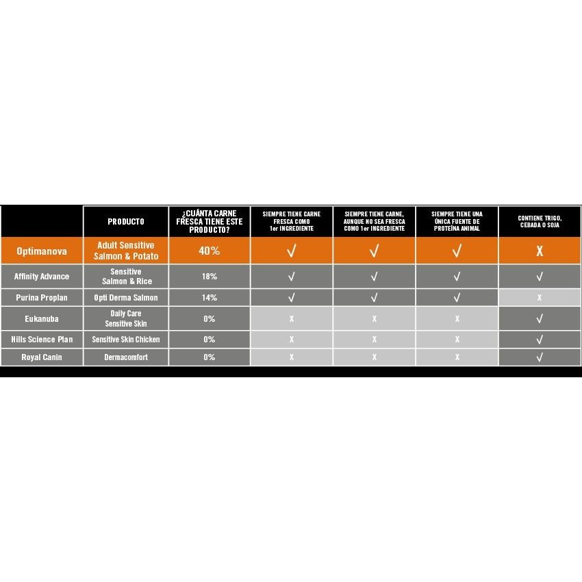 VISAN OPTIMA NOVA ADULT SENSITIVE (salmón y patata), es un alimento completo SIN CEREALES para perros adultos de cualquier raza.* Ideal para perros con pieles sensibles y/o estómagos delicados.INTESTINAL PROTECTION: La acción protectora de la L-glutamina sobre las células de la mucosa intestinal, unida a la acción estimulante de la producción de enzimas digestivas del jengibre facilitan de una manera extraordinaria la digestión de los nutrientes.IMMUNITY CONTROL PROGRAM: Sistema de protección anti-cancerígena, contribuye al desarrollo del sistema nervioso, fortaleciendo el sistema inmune y la salud cardiovascular.GASTRIC PROTECTION: La mezcla especial de los ingredientes provocan una digestión rápida con el mínimo desgaste en el estómago.DIGESTIVE HEALTH SYSTEM: El efecto prebiótico del FOS, estimula la flora bacteriana beneficiosa del sistema digestivo (efecto bífidus), Los MOS eliminan la flora perjudicial, logrando una mejor salud digestiva.SKIN & COAT: La presencia del Zinc ayuda a la regeneración de la piel, manteniéndola en un estado sano y vigoroso. Los ácidos grasos la fortaleceny consiguen un pelo fuerte y brillante.COMPOSICIÓN: Salmón fresco (40%), Harina de salmón (25%), Patata deshidratada (2O%), Proteína de patata, Hidrolizado de salmón (5%), Levadura, Pulpa de remolacha, Aceite, Cloruro sódico, Polifosfatos de sodio (0,3%), Cloruro potásico, Inulina (FOS 1.000 mg/Kg), Jengibre (1.000 mg/Kg), Manano-oligo-sacáridos (260 mg/Kg), Extracto de yucca.CONSTITUYENTES ANALÍTICOS: Proteína bruta 27,00 %, Aceites y grasas brutos 16,00 %, EPA + DHA 2.550 mg/kg, Fibras brutas 2,75 %, Ceniza bruta 7,00 %, Calcio 1,10 %, Fósforo 0,85 %.ADITIVOS: NUTRICIONALES: Vitamina A 18.000 UI/Kg. Vitamina D3 1.800 UI/Kg. Vitamina E 250 mg/Kg. Vitamina C 100 mg/Kg. Biotina 4,0 mg/Kg. Hierro (sulfato ferrosomonohidratado) 68mg/ Kg. Yodo (Yoduro potásico) 3,2 mg/Kg. Cobre (Sulfato cúprico pentahidratado) 9 mg/Kg. Manganeso (sulfato manganoso monohidratado) 6,8 mg/Kg.Zinc (oxido) 135 mg/Kg. Selenio (selenito sódico) 0,1mg/Kg. L-carnitina 70 mg/Kg. Taurina30 mg/Kg.TECNOLÓGICOS: Antioxidantes naturales (tocoferoles).Disponible en envases de 800 gr, 2 kg y 12 kg.
