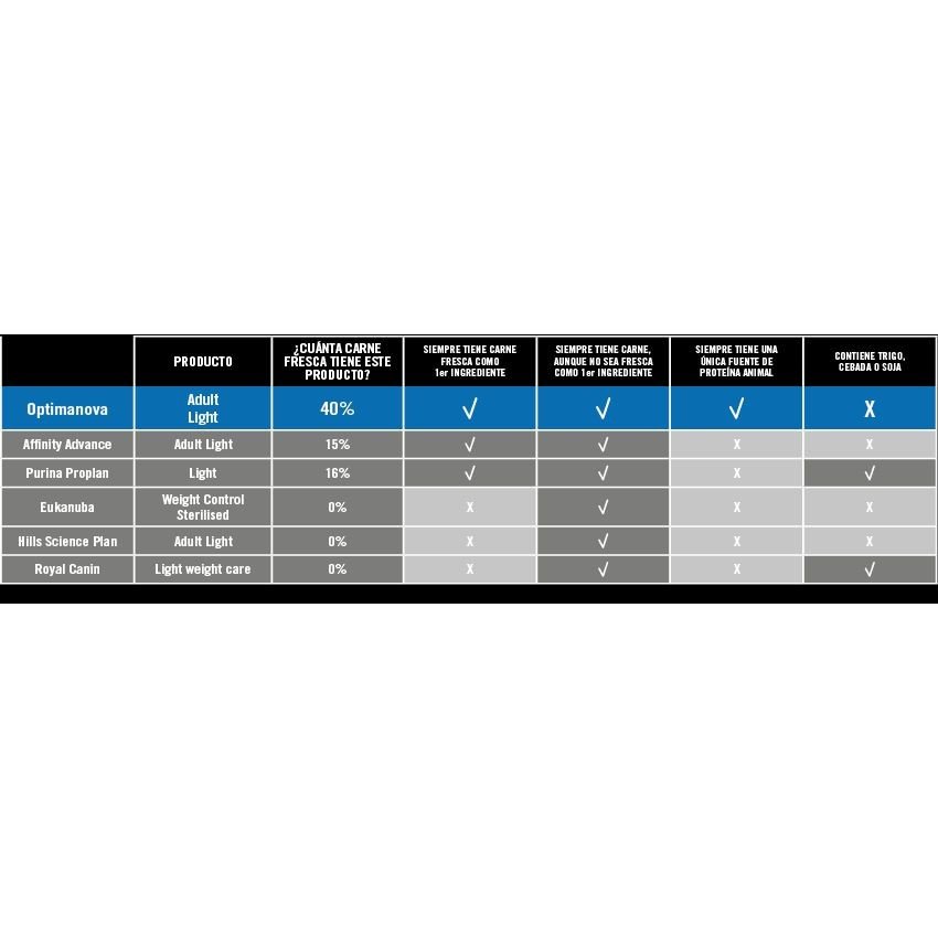 VISAN OPTIMA NOVA CAT LIGHT (pollo y arroz), es un alimento completo para gatos adultos a partir de los 12 meses de edad, formulado para el control de peso.OMEGA 3 Y OMEGA 6:Protege al sistema inmunológico de numerosas enfermedades, ayuda a desarrollar la salud cardiovascular y el sistema nervioso durante la gestación y crecimiento. Evita que el pelo tenga un aspecto seco y quebradizo.SKIN AND COAT PROTECTION:La presencia de el Zinc ayuda a la regeneración de la piel, manteniéndola en un estado sano y vigoroso. Los ácidos grasos la fortalecen y consiguen un pelo fuerte y brillante.FOS+MOS INTESTINAL HEALTH:El efecto prebiótico del FOS, estimula la flora bacteriana beneficiosa del sistema digestivo (efecto bífidus). Los MOS eliminan la flora perjudicial, logrando una mejor salud digestiva.L-CARNITINE:La acción transportadora de la carnitina ayuda a metabilizar las grasas para la producción de energia, conservando las proteínas y la masa muscular.COMPOSICIÓN:Pollo fresco (40%), carne de pollo deshidratada(30%), maiz, arroz (7%), hidrolizado de higado de pollo (5%), gluten de maiz, proteína de arroz, fibras vegetales (celulosa), pulpa de remolacha, levadura, aceite de pollo, aceite de pescado, cloruro sódico, polifosfatos de sodio, Inulina (0.1%, fuente de fructo-oligosacáricos, Manano-oligosacáridos (0.1%), cloruro potasio.CONSTITUYENTES ANALÍTICOS:Proteína bruta 31,0%, aceites y grasas brutas 10,0%, ácidos grasos omega 6: 2,0% ácidos grasos omega 3: 0,4%, fibra bruta 5%, fibra dietética total 14,0%, ceniza bruta 7,0%, Calcio 1,2%, Fósforo 1,0%, humedad 9,%.ADITIVOS:Aditivos Nutricionales:Vitamina A 19.000 UI7mg, Vitamina D3 1.600 UI / mg, Vitamina E 600 mg/kg, Vitamina C 65 mg, L-Tautina 1.000 mg/kg, L- Carnitina 240 mg/kg, DL-metionina 500 mg/kg, Hierro (sulfato ferroso monohidratado) 195 mg/kg, Yodo (yoduro potásico) 3,5 mg/kg, Cobre (sulfato cúprico pentahidratado) 10 mg/kg, Manganeso (sulfato manganoso monohidratado) 9 mg/kg, Zinc (óxido de zinc) 150 mg/kg, Selenio (selenito sódico) 0,23 mg/kg, Extractos de yucca 150 mg/kg, Extractos de cítricos (ricos en bioflavonoides) 1.000 mg/kg, ácido linoleico conjugado 26 mg/kg.Aditivos Tecnológicos:Protegido con antioxidantes naturales (tocoferoles) con efecto antienvejecimiento eliminando los radicales libres (propiciadores de la acción tumoral).Disponible en envases de 400 gr, 2 kg y 8 kg.