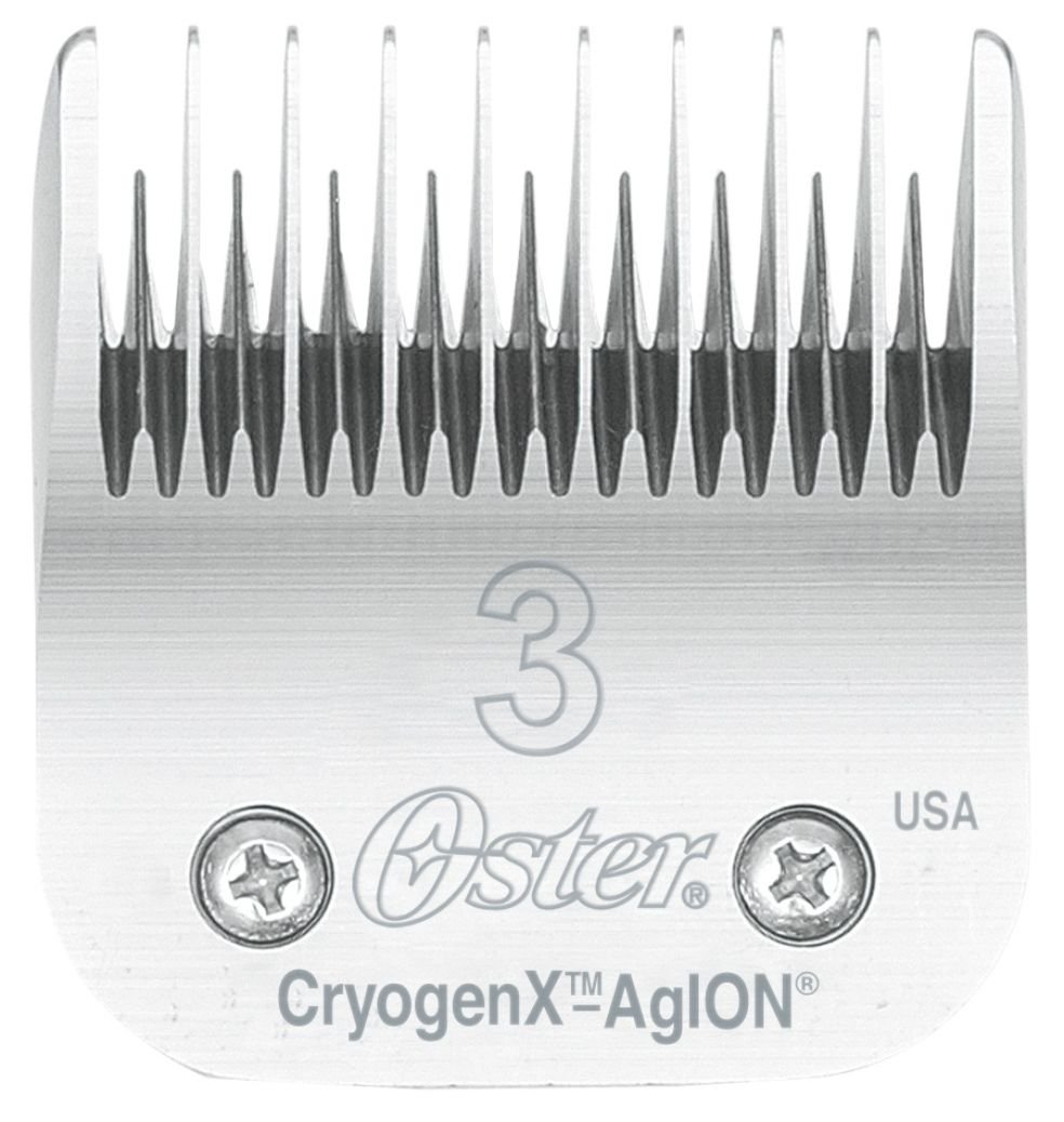 Las nuevas cuchillas Oster para esquiladoras de perros, han sido fabricadas con el más avanzado sistema de protección antimicrobiana: AgION, que utiliza la plata como principal ingrediente activo.La protección antimicrobiana AgION ha sido ampliamente probada, siendo muy efectiva en la prevención del crecimiento de una extensa gama de bacterias y moho.Además, el diseño revolucionario de las nuevas cuchillas Cryogen-AgION, hace que se mantengan frías por más tiempo, multiplicando la duración del filo y facilitando la entrada, incluso en las peores condiciones de pelo. Recuerda siempre limpiar y lubricar las cuchillas al terminar de usarlas. Una cuchilla en buen estado garantiza un buen corte y prolonga la vida útil de la máquina esquiladora. Es imprescindible usar el aceite lubricante para cabezales para todas las cuchillas y, en caso de uso profesional especialmente, es muy útil contar con el baño para cuchillas de Oster. Nota : Se recomienda cepillar bien el pelaje antes del corte, facilitara el trabajo y no desgastara tanto el cabezal. Medidas de otros cabezales:CODIGO TAMAÑO CORTE USOB2600001 Nº 40 0,25 mm Rapado a cero para cirugíasB2600004 Nº 10 1,60 mm Pelados muy cortos (con o sin nudos ) y especialmente para cara, orejas y zonas delicadasB2600005 Nº 7 3,20 mm Dientes especiales para pelos con nudos ( no apelmazados )B2600013 Nº 7 F 3,20 mm Corte en cuerpo para pelos sin nudosB2600006 Nº 5 6,30 mm Corte para pelajes con pocos nudosB2600014 Nº 5F 6,30 mm Corte para pelajes sin nudosB2600011 Nº 4 9,50 mm Corte para pelajes con pocos nudosB2600015 Nº 4F 9,50 mm Corte para pelajes sin nudosB2600086 Nº 3 13,00 mm Corte para pelajes con nudosB2600082 Nº 3F 13,00 mm Corte para pelajes sin nudos