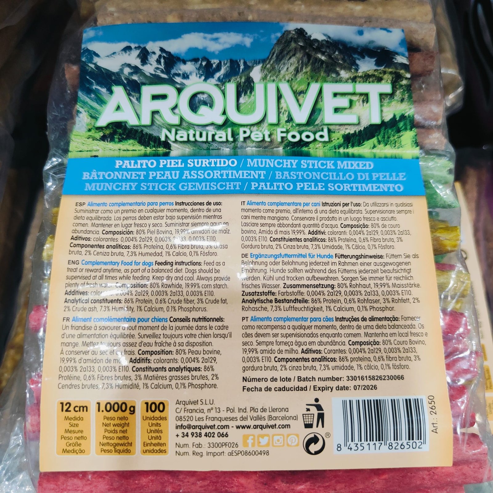 Palitos de piel bovina de varios colores. Ideales como recompensa para los perros. Su consumo evita la formación de sarro, manteniendo las envias fuertes y los dientes sanos y limpios.Deliciosos snacks naturales con proteínas y con un alto valor nutritivo, para mantener a su perro en perfecto estado de salud y vitalidad. Idóneos para premiar su obediencia, educación, adiestramiento, o simplemente como recompensa, pudiendo ofrecérselo a cualquier hora del día.Mantener en lugar fresco y seco, así como no exponer directamente a la luz solar.El perro debe ser supervisado en todo momento mientras se alimenta. Dejar siempre agua dulce y fresca a disposición de su mascota.Composición: 89,9% Piel Bovina, 10% almidón, 0,1% colorantes.Componentes analíticos: 86% Proteína, 0,6% Fibra bruta, 3% Grasa bruta, 2% Ceniza bruta, 7,3% Humedad, 1% Calcio, 0,1% Fósforo.Medidas y peso: 12 cm de largo y un peso de 10 gramos por unidad.