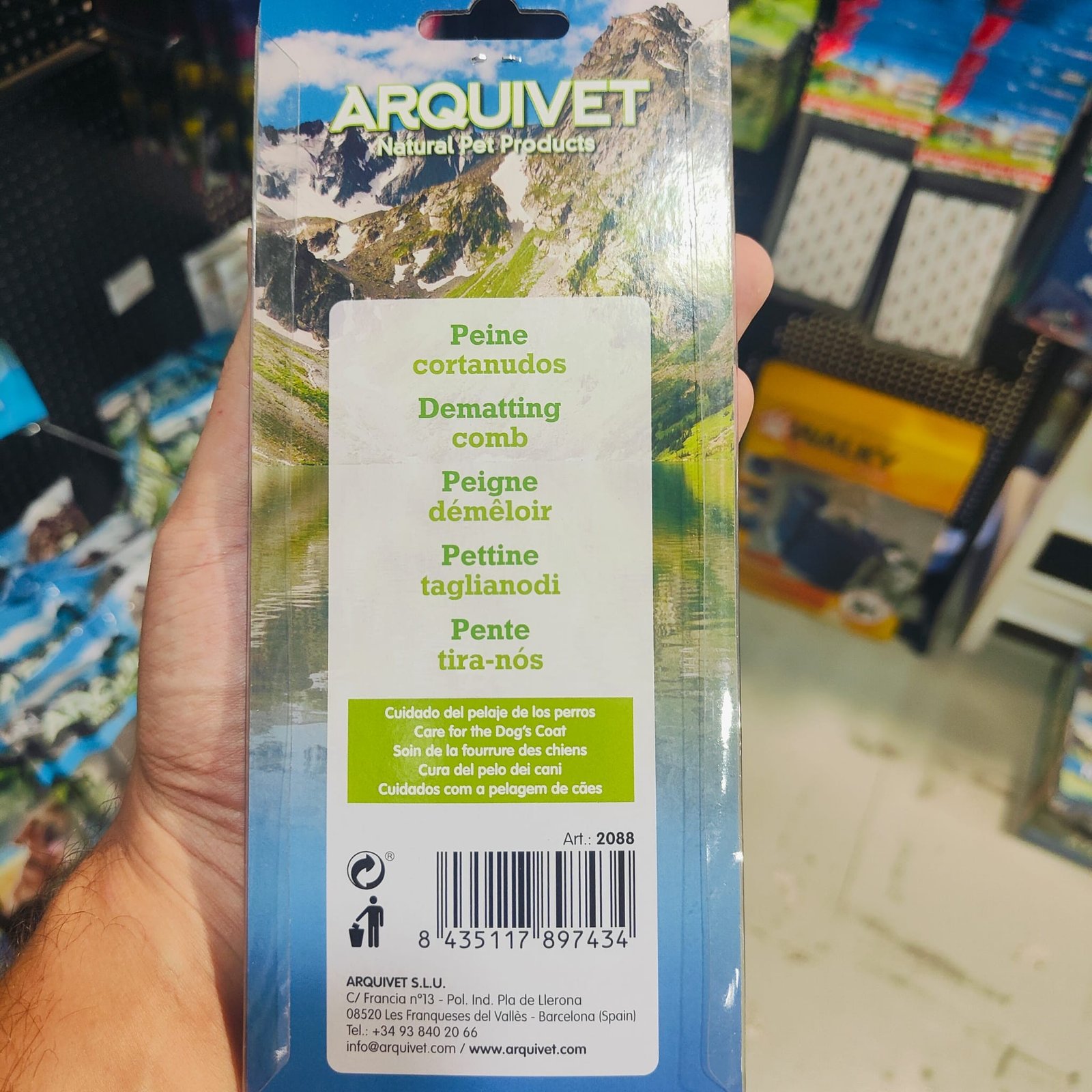 Arquivet Peine Cortanudos es perfecto para eliminar nudos y los enredos capilares en perros con pelaje largo. La púas resistentes tienen adecuada separación para cumplir su función principal, sumado a un manejo fácil gracias a la empuñadura de plástico y goma blanda ergonómica. Medidas 19 x 16 cm.La manera de uso es bastante fácil ya que solamente debe colocar las láminas del rompe nudos en la parte inferior del nudo y al cruzar el cepillo por la atadura, ésta quedará completamente liberada. Los nudos en perros de pelos largos llegaron a su fin con la peineta de Arquivet.¡Vamos! Aprovecha los precios de temporada para cepillar a tu perro con mayor facilidad. VENTAJAS:Elimina nudos y los enredos capilares de perros.Posee púas resistentes con adecuada separación para cumplir su función de peine cortanudos.Tiene empuñadura de plástico y goma blanda ergonómica. USOS Y ESPECIFICACIONES:Peine de muy fácil uso para perros con pelaje largo.
