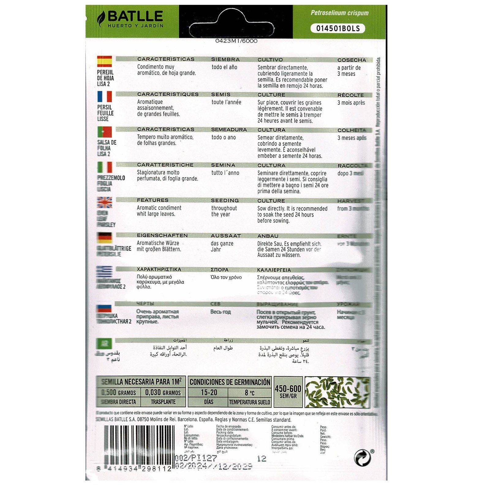 El perejil (Petroselium sativum) es una planta herbácea de la familia de las Umbelíferas. Es ampliamente utilizada por todo el mundo y generalmente se cultiva para ser usada como condimento.Es una planta bienal, aunque puede cultivarse también como anual. Forma una roseta de hojas muy divididas y aromáticas, alcanzando los 15 -20 cm. de altura. Hay dos tipos de perejil: Hoja lisa y Hoja rizadaCONSEJOS GENERALES PARA EL CULTIVO DEL PEREJILEs una planta rústica, aunque prefiere los suelos medios (ni arcillosos, ni ligeros), ricos en materia orgánica y frescos.La siembra puede realizarse durante todo el año en zona de inviernos templados, aunque suele realizarse normalmente entre finales del invierno y mediados del verano.La semilla es muy lenta en germinar, tardando entre 25 y 40 días, por lo que es necesario que haya humedad constante y una temperatura suave para facilitar la emergencia.La siembra puede hacerse a voleo o en líneas separadas 30-40 cm. a una dosis de 1.5 grs/m2. Puede sembrarse también en macetas.No tiene problemas fitosanitarios destacados.La recolección se realiza a los 70-80 días de la siembra, pudiéndose cosechar en varias pasadas cortando las hojas más desarrolladas.PEREJIL COMUN DE HOJA LISAPlanta de tallos erguidos, hojas anchas onduladas de color verde oscuro, muy aromático y de acentuado sabor. Siembra: Se puede realizar todo el año, aunque lo más apropiado es en Primavera, sembrar de asiento o a voleo, o incluso en macetas. Su germinación es lenta, necesita de 20 a 30 días. Es recomendable poner la semilla en remojo 24 horas antes de su siembra. Recolección: A los 3 ó 4 meses de su siembra, por corte de sus tallos que rebrotan ininterrumpidamente.