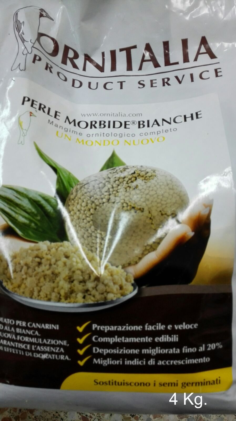 Perle Morbide Bianche 4kg, sustituto del germinado, especialmente indicado para canarios de alas blancas.Descripción: Sustituto del germinado, especialmente indicado para canarios de alas blancas como rojo mosaicos, amarillo mosaico…., intensifica el ala blanca.Composición: Cereales, proteínas vegetales, aceites vegetales, sales minerales, vitaminas (A, B1, B2, B3, B5, B6, B9, B12, C, D3, E, H, Y), aminoácidos (Lisina, metionina) aromas.Análisis: Proteína 16%, grasas 10%, Fibra 3%, Humedad 10%, ceniza 5%, Vitamina A, D3 y EAlimento extrusionado para pajaros granivoros.Modo de empleo: 100 gr. de producto + 200 ml. de agua.dejar reposar 60 minutos.Añadir a la pasta de cria.DETALLESPerle Mórbide® es un alimento completo y extruido compuesto por harinas, aceites, proteinas vegetales…vitamina E, B12, K3, L-lisina, cálcio, magnesio, biotina, extracto de romero y muchos más ingredientes que hacen un producto muy completo y adecuado para la época de cría.Perle Morbide® sustituye COMPLETAMENTE la administración de las semillas germinadas para canarios, jilgueros, Luganos, Verdecillos, Verderones, Cabezitas Negras, Cardenalitos de Venezuela, Camachuelos, pinzones y Exóticos incluyendo estrildas y aves similares, evitando el conocido riesgo de la germinación.BENEFICIOS:• preparación rápida y fácil • Completamente comestible • La puesta de huevos mejorado en un 20% • Eliminación de la micosis y otras enfermedades de riesgo causados por el proceso de germinación • Disminución hasta la desaparición del pichones pequeños con el PUNTO NEGRO • Mejor índice de crecimiento • Posibilidad de añadir en el agua cualquier medicamento o aditivo solublePREPARACIÓN:• Tomar 100gr de producto Perle Morbide ®• Añadir 200gr de agua (siempre debe ser el doble de cantidad que de Perle Morbide ®)• Dejar remojar 2 horas (mínimo 1 hora )• Añadir pasta de cría seca hasta conseguir una mezcla esponjosa dejando ver el “granulado”.NOTA: Considerar en el momento de añadir el agua, la aportación de aditivos en líguido o en polvo para una mejor asimilación por parte del animal.CONSEJOS DE USO Y ADMINISTRACIÓN: • Iniciar la administración alrededor de un mes antes del apareamiento y continuando hasta al menos terminar la muda. • Puede dar Perle Morbide® también durante el período de descanso, dos o tres veces a la semana. • La cantidad a administrar es “a voluntad”, dependiendo siempre de la cantidad de pichones a alimentar.• Como se trata de un producto muy atractivo, se recomienda la administración de al menos 2 cucharadas colmadas por día, en dos etapas: en la mañana y en la tarde / noche. • Preparar el producto todos los días, preferiblemente la noche anterior.• Se recomienda utilizar un cuenco de cerámica.•Al macene en un lugar seco y fresco.VALORES NUTRICIONALES GARANTIZADOS:Proteína cruda (min) 16% Grasa bruta (min) 10% La fibra cruda (max) 3% Humedad (max) 10% Cenizas (max) 4% Vitamina A (Min) 17,500 UI / kg La vitamina D3 (min) 800 UI / kg Vitamina E (min) 200 UI / kg Cobre (min) 10 mg / kgINGREDIENTESMaíz, trigo molido, avena molida, gluten de harina de maíz, aceite de coco, aceite de soja, proteína de patata, Calcio Carbonato, fosfato dicálcico, L-lisina, colina Sabores naturales y artificiales, cloruro, DL Metionina , Vitamina E.Suplementos,calcio L- ascorbilo 2 – monofosfato (Vitamina C estabilizada), biotina , extracto de Yucca schidigera, óxido de zinc, óxido de manganeso, Niacinamida, Vitamina B12.Suplemento, extracto de romero, sulfato de cobre, calcio Yodado, betacaroteno, óxido de magnesio, vitamina A, Acetato, pantotenato de calcio, selenita de sodio, Ácido Fólico, Riboavina, clorhidrato de piridoxina, Mononitrato de tiamina, colorantes naturales y artificiales, Menadiona, complejo de bisolfato sódico (fuente de vitamina K3 ), suplemento de vitamina D3, Sulfato de Cobalto, Mixet tocoferoles .
