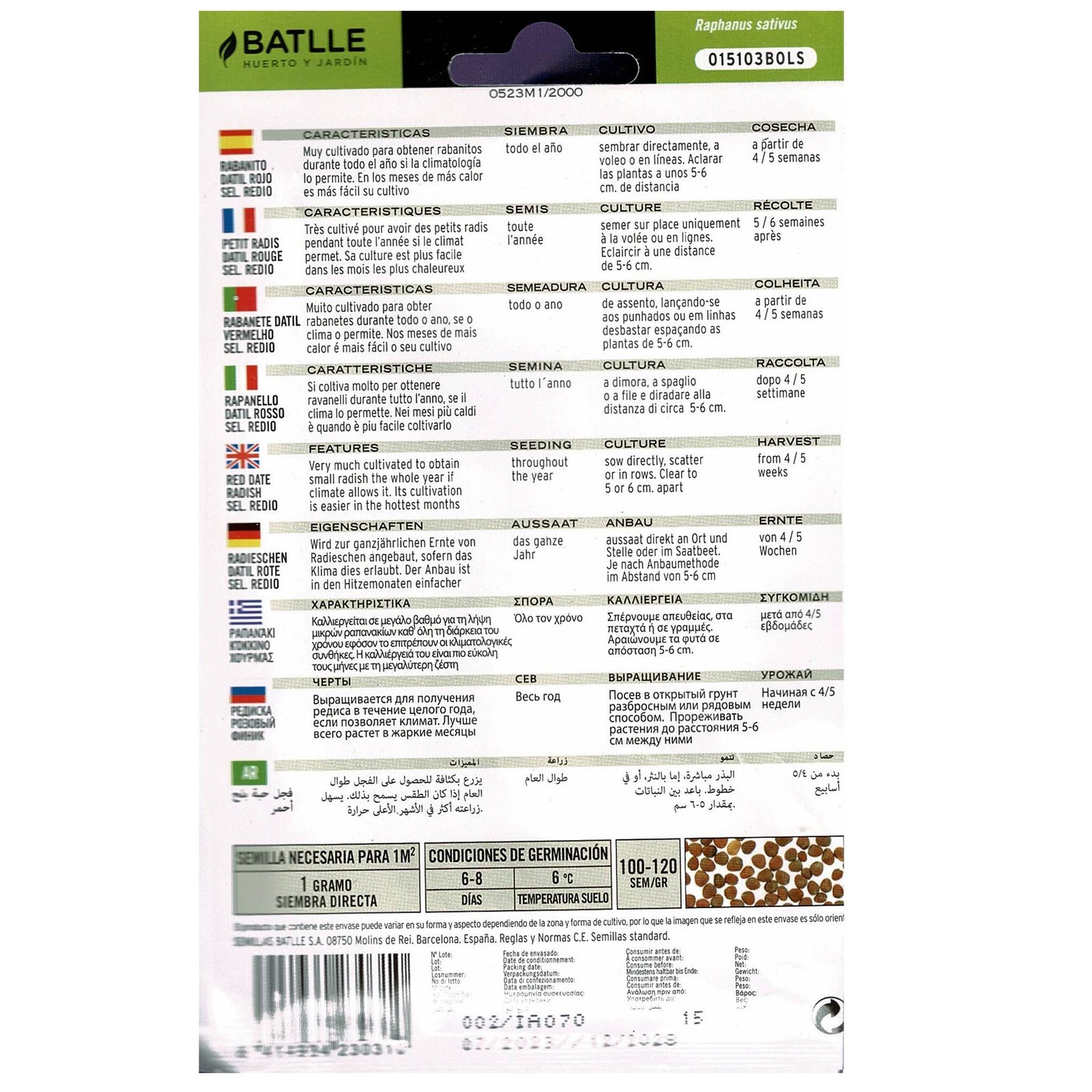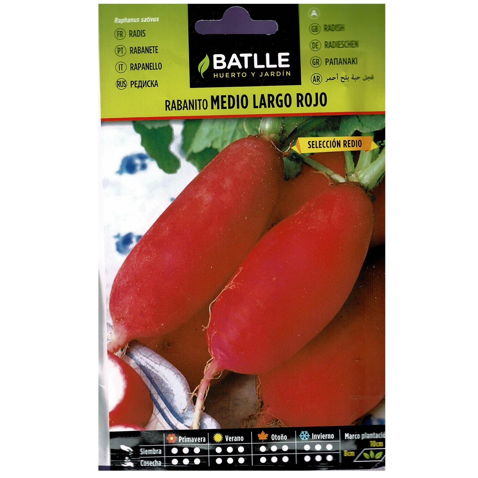 El rábano (Raphanus sativus), es una planta de la familia Crucíferas, que se cultiva por sus raíces comestibles. Es un cultivo muy fácil y rápido. Cada 30 días podemos tener rabanitos bien formados y listos para comer. Tiene diferentes formas (redondeado, mediolargo y largo) y coloraciones (blanco, rojo, rosa con punta blanca, etc.). Hay dos subespecies el sativus que es el rabanito y longipinnatus que es el rábano tipo japonés o daikon.. Muy apreciado en ensaladas por su colorido y sabor característico.CONSEJOS GENERALES PARA EL CULTIVO DE LOS RABANITOSAl ser una especie de crecimiento rápido y producir plantas de pequeño tamaño, la fase de la siembra es la más delicada.Utilizar una variedad adaptada a la época de siembra. Para las siembras de Otoño y Primavera, casi todas las variedades son aconsejables por ser la época de cultivo más fácil. Para las siembras de Invierno, variedades adecuadas para los días cortos y para siembras de Verano, variedades tardías y de raíz compacta.La textura de la parcela debe ser ligera o franca y de una buena fertilidad.Elegir un buen lugar de la parcela en función de la estación del año. En Invierno las siembras se harán bajo plástico o protegidas de alguna forma. En Primavera y Otoño se puede hacer en cualquier lugar, pero en Verano es recomendado sembrar en lugares sombreados y frescos.Sembrar semilla a semilla en líneas. Es más engorroso que la siembra a voleo pero se evita que la nascencia sea heterogénea con la pérdida de plantas al no formar la raíz correctamente, ya que el rabanito a pesar de su pequeño tamaño necesita una determinada superficie para su perfecto desarrollo.Enterrar las semillas a una profundidad correcta ya que influye sobre la forma posterior. Las variedades redondas superficialmente (0,5-1 cm. máximo) y las mediolargas a 2-3 cm.Regar frecuentemente, ya que al ser de crecimiento rápido necesita una humedad constante sin encharcamientos. Es muy adecuado el riego por aspersión. Si pasa periodos de sequía afecta al desarrollo y calidad de las raíces.Recolectar en el momento oportuno. Es más aconsejable recogerlos antes de su completo desarrollo que pasados, ya que la calidad se verá afectada.RABANITO DATIL ROJO SEL. REDIOMuy cultivado para obtener rabanitos durante todo el año si la climatología lo permite. En los meses de más calor es más fácil su cultivo. Siembra: Puede realizarse todo el año, con preferencia de Agosto a Noviembre y de Febrero a Abril, sembrar a voleo o a líneas, aclarando cuando tengan 2 hojas. La semilla debe ser enterrada muy superficialmente. Recolección: De 5 a 6 semanas de su siembra