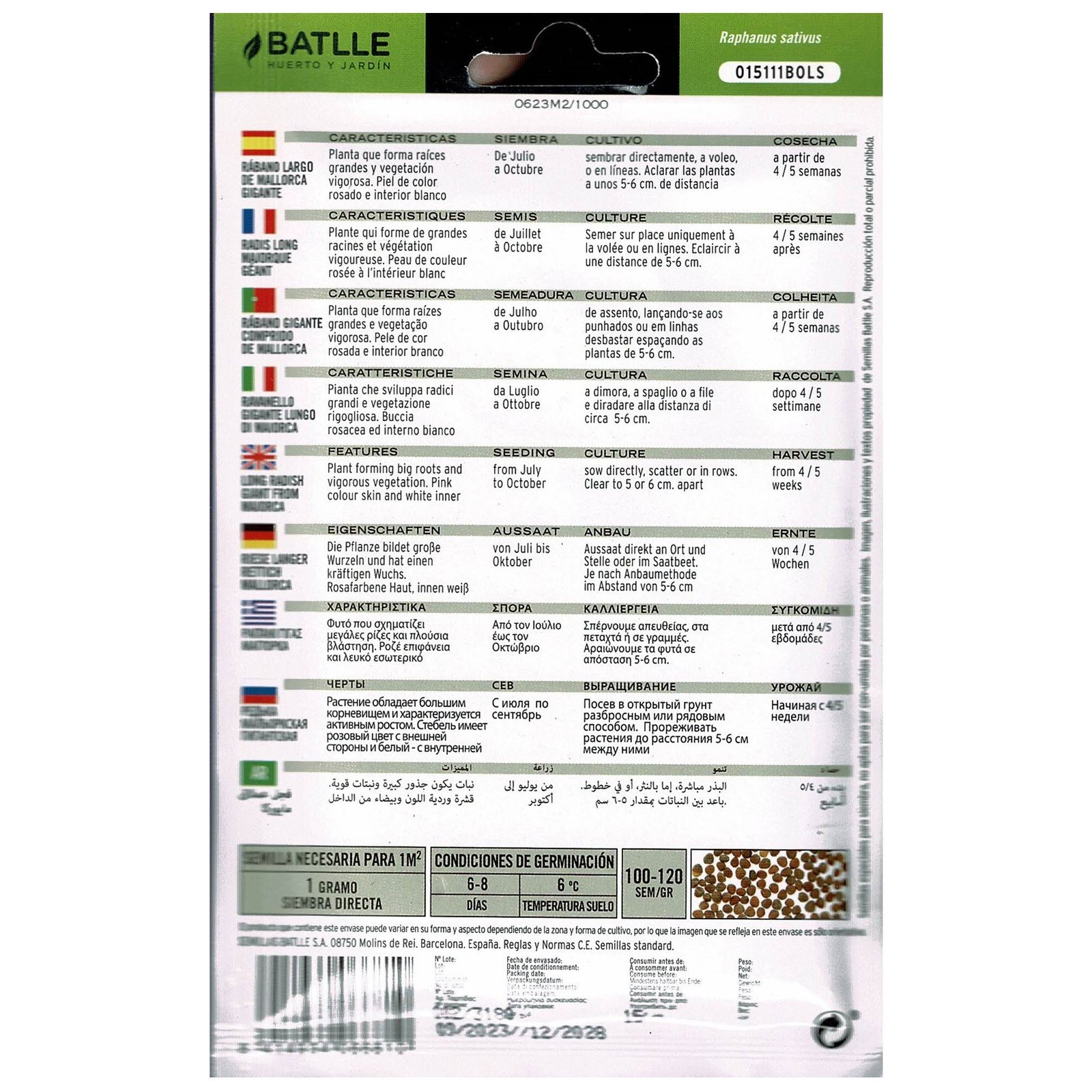 El rábano (Raphanus sativus), es una planta de la familia Crucíferas, que se cultiva por sus raíces comestibles. Es un cultivo muy fácil y rápido. Cada 30 días podemos tener rabanitos bien formados y listos para comer. Tiene diferentes formas (redondeado, mediolargo y largo) y coloraciones (blanco, rojo, rosa con punta blanca, etc.). Hay dos subespecies el sativus que es el rabanito y longipinnatus que es el rábano tipo japonés o daikon.. Muy apreciado en ensaladas por su colorido y sabor característico.CONSEJOS GENERALES PARA EL CULTIVO DE LOS RABANITOSAl ser una especie de crecimiento rápido y producir plantas de pequeño tamaño, la fase de la siembra es la más delicada.Utilizar una variedad adaptada a la época de siembra. Para las siembras de Otoño y Primavera, casi todas las variedades son aconsejables por ser la época de cultivo más fácil. Para las siembras de Invierno, variedades adecuadas para los días cortos y para siembras de Verano, variedades tardías y de raíz compacta.La textura de la parcela debe ser ligera o franca y de una buena fertilidad.Elegir un buen lugar de la parcela en función de la estación del año. En Invierno las siembras se harán bajo plástico o protegidas de alguna forma. En Primavera y Otoño se puede hacer en cualquier lugar, pero en Verano es recomendado sembrar en lugares sombreados y frescos.Sembrar semilla a semilla en líneas. Es más engorroso que la siembra a voleo pero se evita que la nascencia sea heterogénea con la pérdida de plantas al no formar la raíz correctamente, ya que el rabanito a pesar de su pequeño tamaño necesita una determinada superficie para su perfecto desarrollo.Enterrar las semillas a una profundidad correcta ya que influye sobre la forma posterior. Las variedades redondas superficialmente (0,5-1 cm. máximo) y las mediolargas a 2-3 cm.Regar frecuentemente, ya que al ser de crecimiento rápido necesita una humedad constante sin encharcamientos. Es muy adecuado el riego por aspersión. Si pasa periodos de sequía afecta al desarrollo y calidad de las raíces.Recolectar en el momento oportuno. Es más aconsejable recogerlos antes de su completo desarrollo que pasados, ya que la calidad se verá afectada.RABANO GIGANTE DE MALLORCAPlanta que forma raíces grandes y vegetación vigorosa. Piel de color rosado e interior blanco, se utiliza junto al Pimiento Ros de Mallorca para acompañar la paella y también como picadillo Trempo de Mallorca. Siembra: Preferentemente de Julio a Octubre, solo de asiento y a voleo o a líneas, aclarando cuando tengan 2 hojas. La semilla debe ser enterrada muy superficialmente.