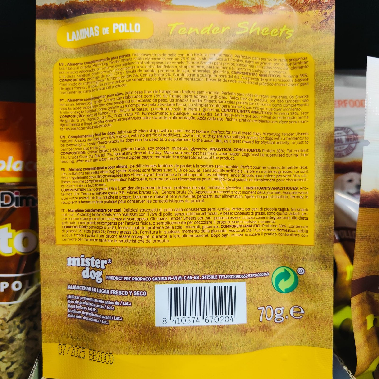 Snack Laminas de Pollo 70 Gr. Mister Dog. Pensado para ofrecer comodidad, seguridad y diversión a tu perro en su día a día.
