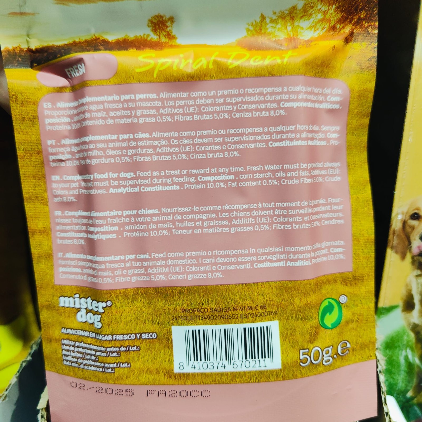 SpiralDent Fresa 250 gr.Deliciosos snacks dentales para cuidar la dentadura de tu mejor amigo. En forma de barritas estos snacks dentales colaboran en la higiene dental de tu perro sea cual sea su raza y tamaño. Cada paquete de 50 gramos incluye 5 barritas de 8 centímetros aproximadamente. Premia a tu perro con una golosina que refrescará su aliento a la vez que elimina y previene el sarro. Disponible en 3 sabores: Menta, Fresa y Vainilla. Se venden en packs de 5 bolsas de 50 gramos cada una.Ofrece a tu mejor amigo estas magnificas barritas dentales eligiendo el sabor que más le guste, son fáciles de masticar y realizan un mantenimiento completo, previniendo el sarro que pueda fijarse en la dentadura de su perro.Ventajas de los snacks dentales SpiralDent:- Refrescan el aliento- Elimina y previene la formación de sarro.- Válidas para todo tipo de razas y tamaños.- Fáciles de masticar.- Ayudan a mantener una buena higiene dental.- No contienen subproductos animales.- Muy sabrosas.Ingredientes: almidón de maíz, glicerina vegetal, aditivos, colorantes, saborizantes.Modo de empleo: Alimentar como premio o recompensa a cualquier hora del día. Proporciones siempre agua fresca a su mascota. Los perros deben ser supervisados durante su alimentación.