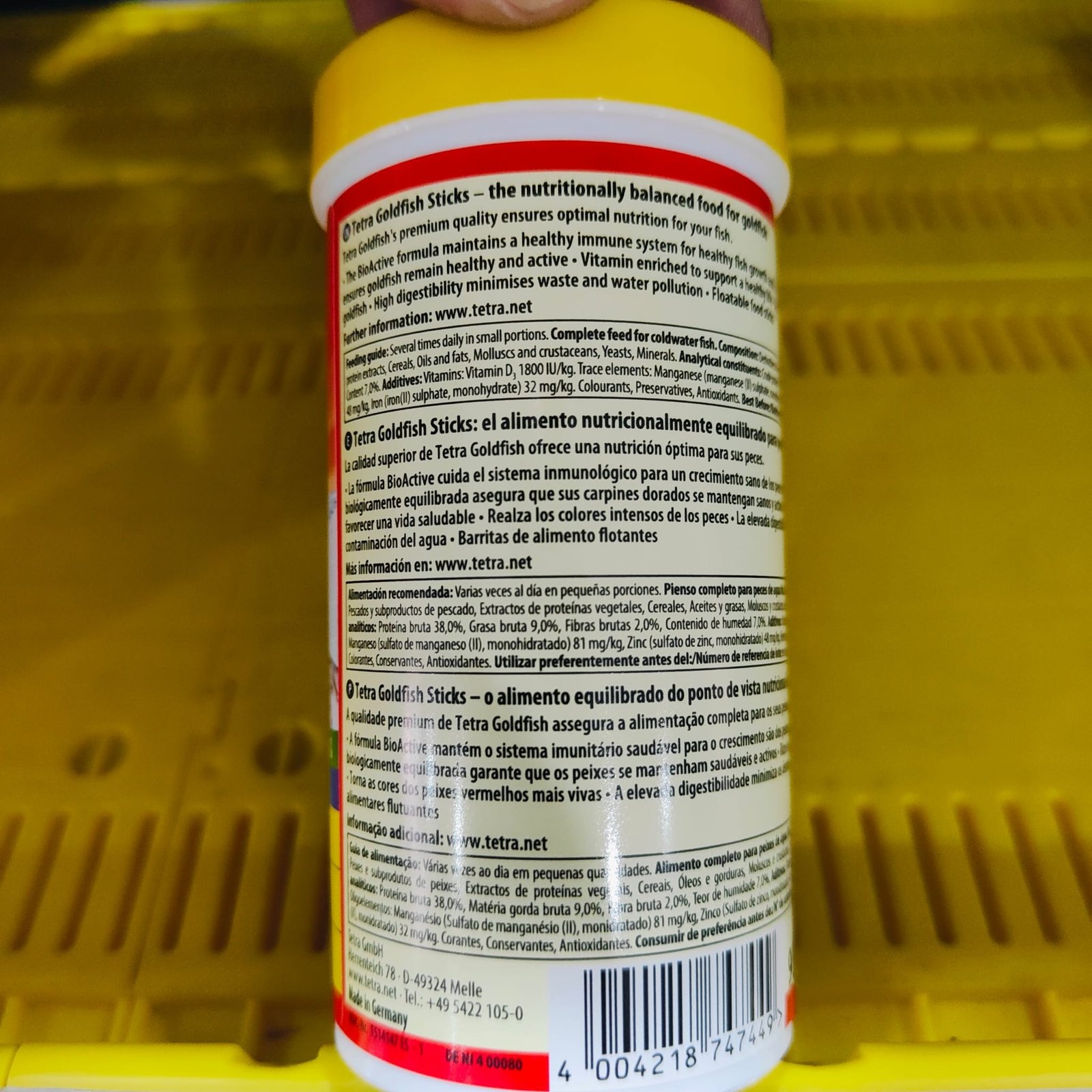 Tetra GoldFish Energy, es un alimento premium en sticks nutricionalmente equilibrado para todos los carpines dorados y otros peces de agua fría. Este alimento es una mezcla cuidadosamente seleccionada de nutrientes de gran calidad con vitaminas, minerales y elementos traza para una nutrición equilibrada.Con este alimento asegurarás una vida larga y sana para tus peces, además de realzar sus espléndidos colores.Otra cualidad del mejorado tetra Goldfish es que utilizado en la medida correcta mejora el aprovechamiento del alimento, consiguiendo disminuir la cantidad de excrementos de los peces y manteniendo el acuario más limpioCOMPOSICION:Subproductos de origen vegetal, Pescado y Subproductos de pescado, Cereales, Levaduras, Extractos de proteína vegetales, Moluscos y crustáceos, Aceites y grasas, Sustancias minerales.COMPONENTES ANALITICOS:Proteina bruta, 38%, Aceites y grasas brutos 9%, Fibras brutas 2%, Contenido de humedad 7%.
