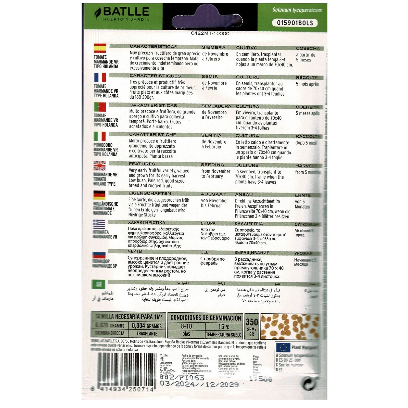 El tomate es una planta herbácea perenne, cultivada como anual, sensible al frío. Las variedades precoces (las que florecen y fructifican más rápido) suelen alcanzar una longitud de 1,2 m, las tardías, en cambio, casi siempre son más grandes y llegan a los 2,5 m de longitud.El fruto es una baya. En las especies silvestres de tomate el fruto es bilocular, mientras que en las variedades cultivadas es bilocular o 30-locular, siendo lo más frecuente, de 5 a 9 lóculos. La forma del fruto es variable, generalmente depreso-globoso u oblongo. Presentan numerosas semillas, pequeñas, aplanadas, amarillento-grisáceas, velludas, embebidas en una masa gelatinosa formada por el tejido parenquimático que llena las cavidades del fruto maduro.CONSEJOS GENERALES PARA EL CULTIVO DEL TOMATEPrefiere los suelos fértiles, frescos, humíferos, sueltos, permeables y profundos.Es una planta de clima tropical, por lo que vegeta bien en los climas mediterráneos que casi sin forzar el cultivo se puede cosechar durante todo el año. La temperatura mínima es de 12ºC y la óptima se encuentra centrada entre 18 y 20ºC.La siembra se efectúa en semilleros de bandejas con alveolos principalmente, o con siembra directa, utilizado casi exclusivamente cuando se trata de tomate rastrero para industria. Los semilleros en bandejas se realizan en invernaderos climatizados.El trasplante se realiza a partir del momento que no se prevean heladas en la zonaSi son variedades de crecimiento indeterminado se procederá al entutorado de las plantas cuando tengan 20-30 cm. de altura.El marco de plantación oscila entre 40-70 cm. entre plantas y 60-120 cm. entre líneas. Así resultará una población entre 20.000 para variedades de mercado vigorosas y casi 40.000 para variedades de industria de vegetación compacta.Regar inmediatamente después del trasplante, después a los 20-25 días cuando cuajen las primeras flores y a continuación cada 8-10 días aproximadamente. Si se riega a goteo hay que tener en cuenta que las mayores necesidades de agua son a partir del cuajado de frutos.Es una planta que acepta bien los abonados abundantes. Se realizará de fondo a base de N-P-K y Magnesio y durante el cultivo aportaciones de Nitrógeno y Potasio.Cuidar la sanidad del cultivo con esmero sobre todo cuando las condiciones ambientales son algo extremas para su cultivo como alta humedad, temperaturas bajas o muy altas o después de cada poda o recolección que se realizan heridas en la planta.Es aconsejable podar las plantas y hay variedades que es imprescindible. Con ella se consigue aumentar la producción, mayor precocidad, mejor calidad y más facilidad al realizar los tratamientos al no tener tanto follaje.Según el destino de los frutos(mercado para ensaladas, mercado maduro, ramilletes, “pa amb tomaquet”, industria concentrado, industria pelado, tacos, etc.) y tipo de frutos ( acostillados, redondeados, pera, larga vida, etc.) la recolección se realiza en un momento u en otro.Las variedades para industria son totalmente mecanizables.TOMATE MARMANDE VR TIPO HOLANDA RAFFEs un tomate multilobular, acostillado, cuello verde y forma ligeramente achatada. Su peso es de 180-200 grs. El porte de la planta es semi-determinado alto y es resistente al Fusarium. Tiene un excelente sabor y un tradicional olor a tomate.Puede cultivarse tanto al aire libre como en invernadero. La calidad del tomate MARMANDE RAF es mucho mejor en ciclos de cultivos de Otoño-Invierno-Primavera (siembras a partir de Agosto) dando un tomate más acostillado, cuello más verde y mejor sabor. Las siembras de Enero-Febrero-Marzo (tradicionales en zonas continentales) dan una producción en Verano, produciendo frutos menos acostillados, poco cuello verde, más rojos, más blandos y con menos sabor.