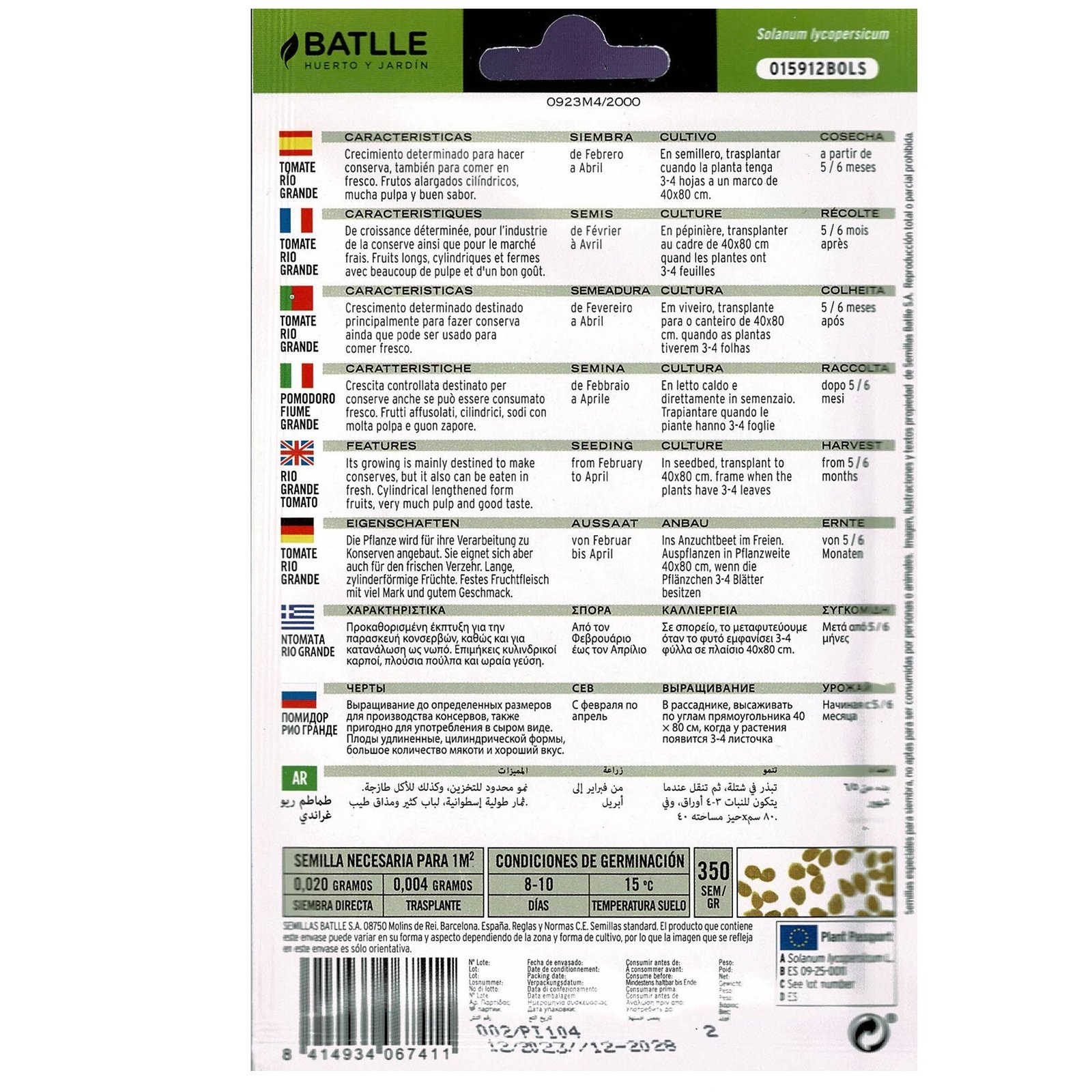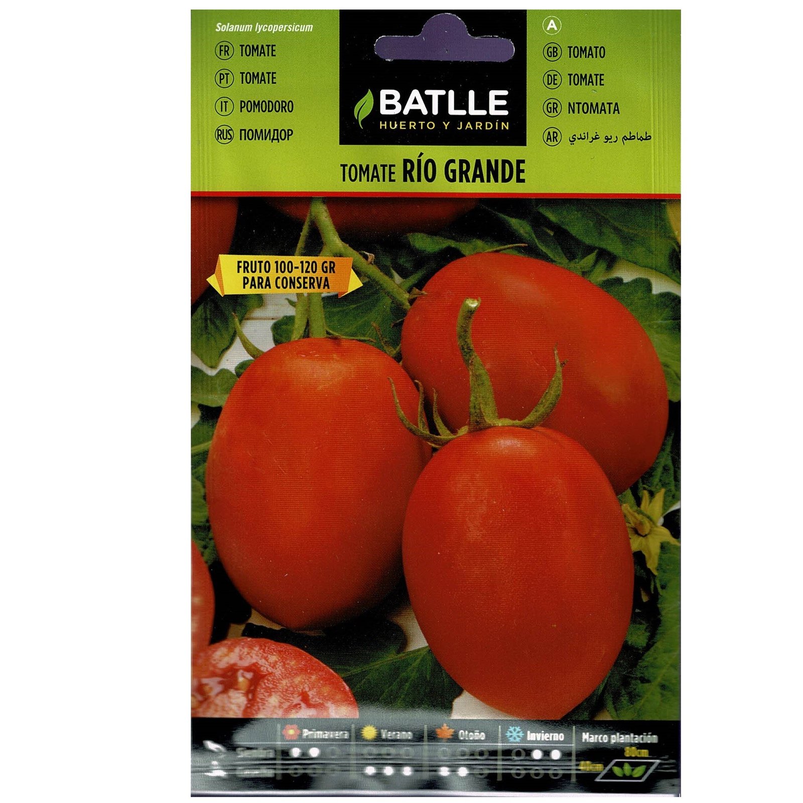 El tomate es una planta herbácea perenne, cultivada como anual, sensible al frío. Las variedades precoces (las que florecen y fructifican más rápido) suelen alcanzar una longitud de 1,2 m, las tardías, en cambio, casi siempre son más grandes y llegan a los 2,5 m de longitud.El fruto es una baya. En las especies silvestres de tomate el fruto es bilocular, mientras que en las variedades cultivadas es bilocular o 30-locular, siendo lo más frecuente, de 5 a 9 lóculos. La forma del fruto es variable, generalmente depreso-globoso u oblongo. Presentan numerosas semillas, pequeñas, aplanadas, amarillento-grisáceas, velludas, embebidas en una masa gelatinosa formada por el tejido parenquimático que llena las cavidades del fruto maduro.CONSEJOS GENERALES PARA EL CULTIVO DEL TOMATEPrefiere los suelos fértiles, frescos, humíferos, sueltos, permeables y profundos.Es una planta de clima tropical, por lo que vegeta bien en los climas mediterráneos que casi sin forzar el cultivo se puede cosechar durante todo el año. La temperatura mínima es de 12ºC y la óptima se encuentra centrada entre 18 y 20ºC.La siembra se efectúa en semilleros de bandejas con alveolos principalmente, o con siembra directa, utilizado casi exclusivamente cuando se trata de tomate rastrero para industria. Los semilleros en bandejas se realizan en invernaderos climatizados.El trasplante se realiza a partir del momento que no se prevean heladas en la zonaSi son variedades de crecimiento indeterminado se procederá al entutorado de las plantas cuando tengan 20-30 cm. de altura.El marco de plantación oscila entre 40-70 cm. entre plantas y 60-120 cm. entre líneas. Así resultará una población entre 20.000 para variedades de mercado vigorosas y casi 40.000 para variedades de industria de vegetación compacta.Regar inmediatamente después del trasplante, después a los 20-25 días cuando cuajen las primeras flores y a continuación cada 8-10 días aproximadamente. Si se riega a goteo hay que tener en cuenta que las mayores necesidades de agua son a partir del cuajado de frutos.Es una planta que acepta bien los abonados abundantes. Se realizará de fondo a base de N-P-K y Magnesio y durante el cultivo aportaciones de Nitrógeno y Potasio.Cuidar la sanidad del cultivo con esmero sobre todo cuando las condiciones ambientales son algo extremas para su cultivo como alta humedad, temperaturas bajas o muy altas o después de cada poda o recolección que se realizan heridas en la planta.Es aconsejable podar las plantas y hay variedades que es imprescindible. Con ella se consigue aumentar la producción, mayor precocidad, mejor calidad y más facilidad al realizar los tratamientos al no tener tanto follaje.Según el destino de los frutos(mercado para ensaladas, mercado maduro, ramilletes, “pa amb tomaquet”, industria concentrado, industria pelado, tacos, etc.) y tipo de frutos ( acostillados, redondeados, pera, larga vida, etc.) la recolección se realiza en un momento u en otro.Las variedades para industria son totalmente mecanizables.TOMATE RIO GRANDEVariedad de tomate rastrero, crecimiento determinado destinado principalmente para hacer conserva aunque puede usarse también para comer en fresco. Frutos alargados cilindricos, firmes con mucha pulpa y buen sabor.Siembra: De Febrero a Abril en semilleros a la dosis de 5-6 grs./m.2 o en bandejas para trasplantar posteriormente en cepellón. El trasplante se realiza a los 60-70 días cuando no haya peiigro de heladas al marco de 100×40 cms. Cuando las plantas enrraizen hay que formar un buen caballón.Recolección: De Junio a Septiembre según zona y fecha de siembra. Producción escalonada.